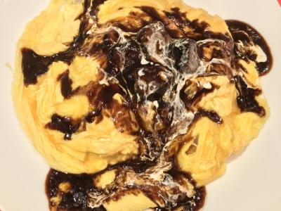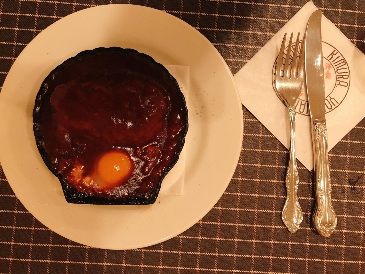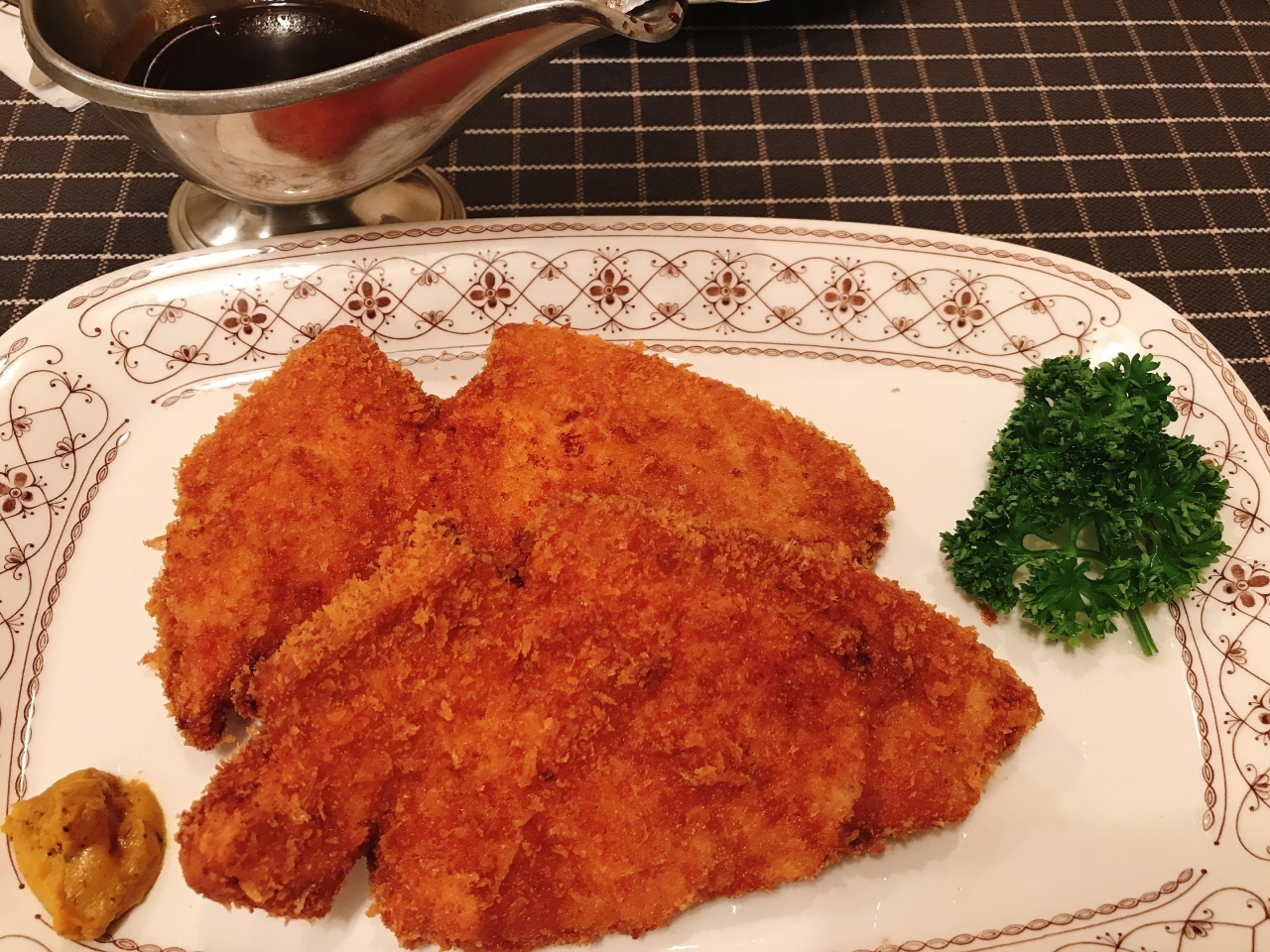 私のポークカツはなんと2枚で登場! 熱々揚げたてはもちろんなれど、肉が旨い! 脂身もあるのでロースなのでしょうが、上品なヒレのような味わいでした。1枚半は特製のウスターソース?と何やら隠し味が入っていそうなマスタードを付けていただきました。でも豚カツっぽくならないところが素晴らしい。残りの半枚にはハンバーグのデミソをまとわせて・・・。美味しいに決まっています。どちらも「洋食」ながら”フレンチ”でも味わっているかのような感じでした。