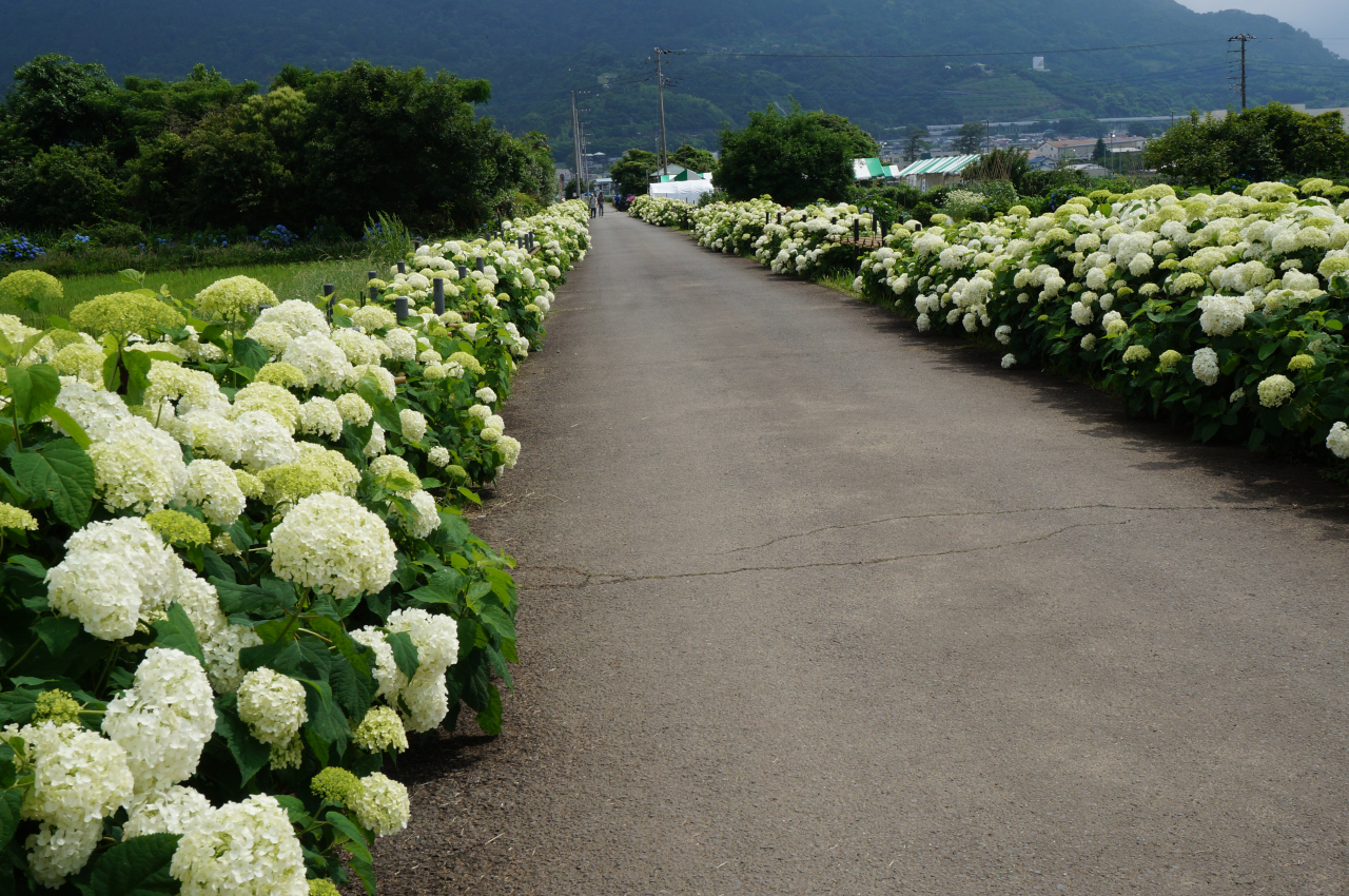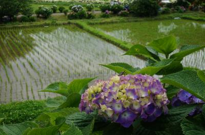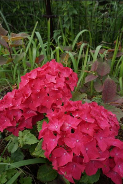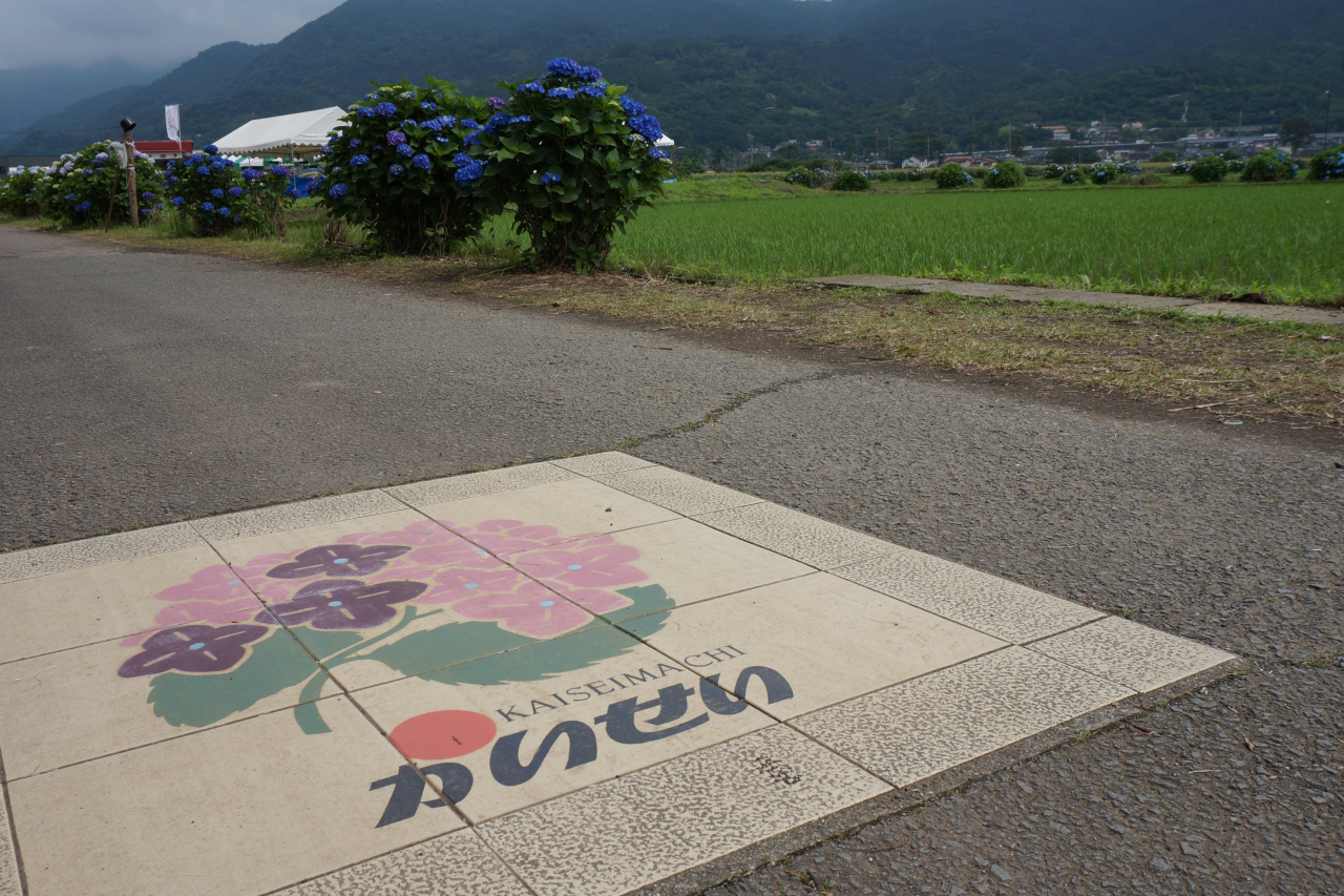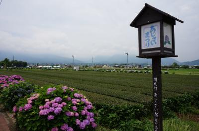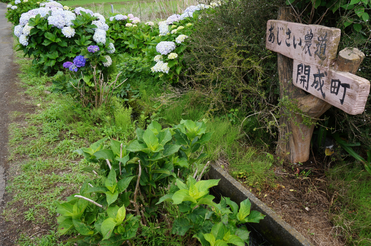 水辺公園から北の広い範囲にあじさいが分布しているのですが、まとまって植わっているというよりも、小川や用水路、そして田圃や茶畑の畦道沿いに並んで咲き競っているというイメージでしょうか。開成ブルーの鮮やかな色も印象的ですが、真紅のあじさいは初めて見ました。