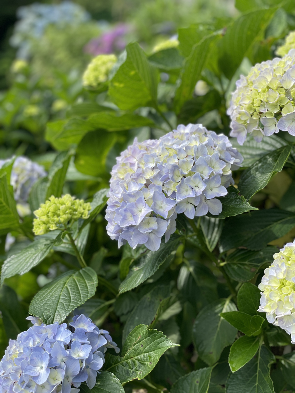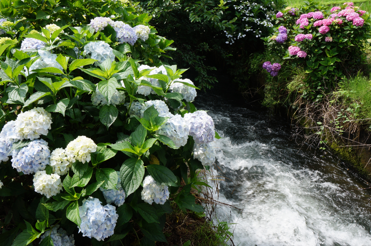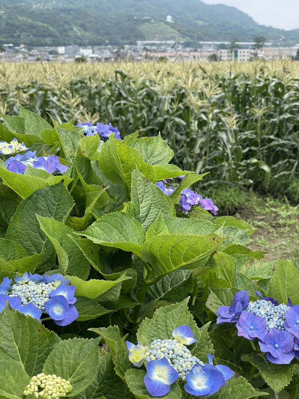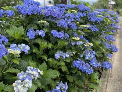 水辺公園から北の広い範囲にあじさいが分布しているのですが、まとまって植わっているというよりも、小川や用水路、そして田圃や茶畑の畦道沿いに並んで咲き競っているというイメージでしょうか。開成ブルーの鮮やかな色も印象的ですが、真紅のあじさいは初めて見ました。