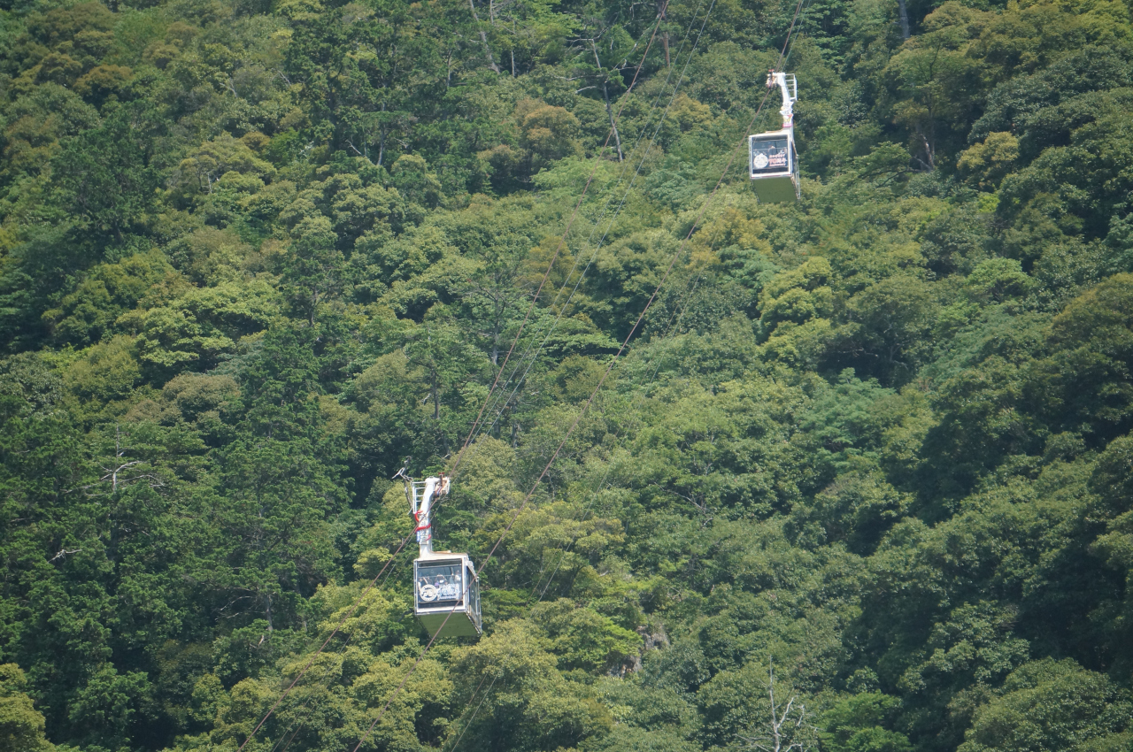 宮城県と区別するために「ぎふ金華山」との呼称を用いているようです。オープンしたばかりの岐阜城楽市の通りを抜けた先のゆるやかな坂道をそのまま少し上がると千畳敷と呼ばれる場所に立つ山麓駅ですが、土曜であったのでそれなりに列びました。風景は静岡市の日本平ロープウェイに似ていますが、それ以上の急角度を3分強、山頂駅まで上って行きます。左手に建つ美しい三重塔も間近に眺められます。