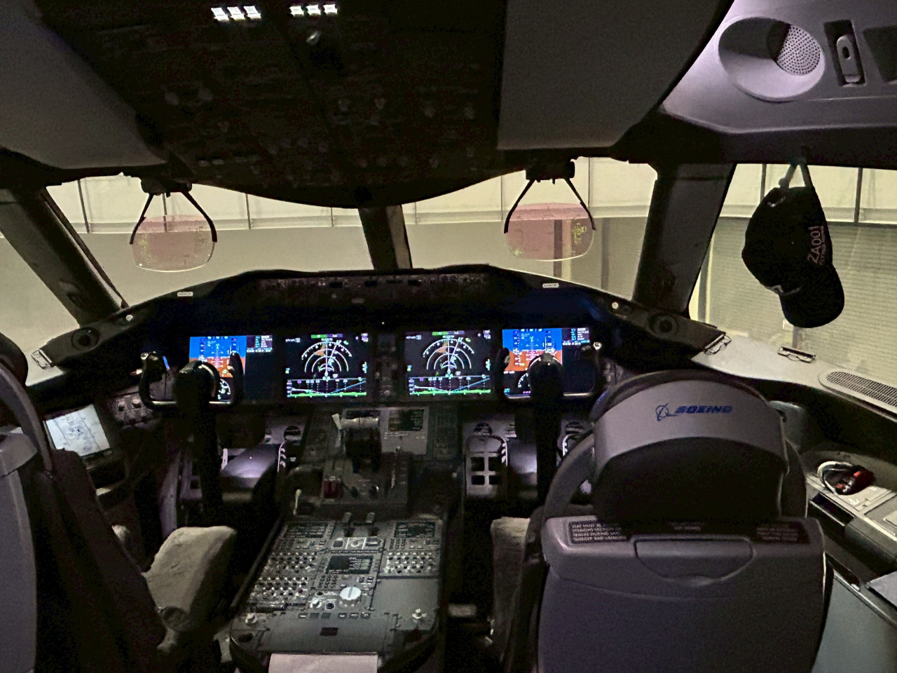 次に一番人気のコックピット見学を時間予約しましょう。最大7名が3分間ずつといったペースで進みます。スタンバイ列に列んでも良いのですが、機体を外から見学している間にすぐ予約時刻が来るので、ファストパス的な時間予約がおすすめです。列んでいる間にも、普段は見ることのない飛行機の真下に付いている機器、例えば客室内へ空気を取り込むエアインテークなどを観察できるのでより興奮します。左右対称ではないことも新たな発見でした。