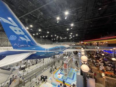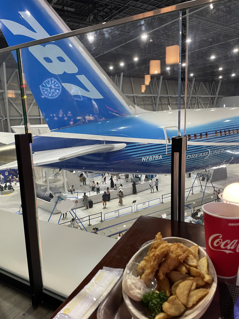 昼食は、ボーイング創業の街シアトルをテーマとした「シアトルテラス」で多彩なグルメから選べます。私は「THE PIKE BREWING RESTAURANT & CRAFT BEER BAR」でのクラフトビール&クラムチャウダーと悩みましたが、結局「SEATTLE FISH MARKET」で、港町シアトル市民に愛される「フィッシュ&チップス」の魅力に負けました。ふわふわ&ジューシーな白身魚に自家製タルタルソースをたっぷりつけて熱々を楽しみました。フレンチフライも良い塩加減でした♪