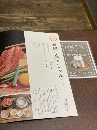 夜はホルモンや創作料理が中心の店のようでしたが、ランチは飛騨牛焼きしゃぶが2,500円で、プリンを200円で付けることが出来ました。飛騨牛らしい旨味のある肉で、一人用の釜で炊き上げられたご飯との相性も抜群でした。小鉢の煮物も良いお味でした。