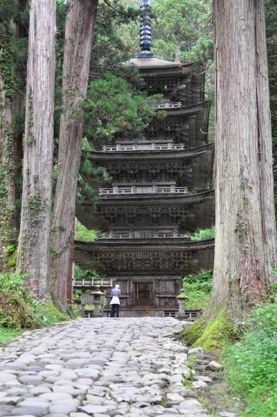 まず下の駐車場に車を駐めて、家族4人で五重塔へ向かいました。いきなり杉並木の中の石段を下るのですが、趣きある朱色の橋や滝が迎えてくれます。爺杉を見つけたら右奥を覗きましょう。そこにあの有名な五重塔が全く違和感なく佇んでいるのです。時間が止まったかのようなその空間は、間違いなく厳かな心持ちにさせてくれます。そこから急な石段が始まります。