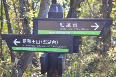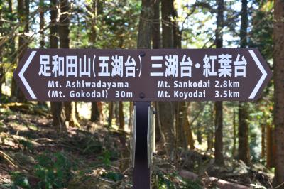 三湖台から足和田山までのコースタイムは60分とのことですが、私たち夫婦は70分以上掛かりました。立ち止まって写真を撮っているせいもあるでしょう。東海自然歩道として整備されている登山道にもキツい登り下りは時折ある程度で、尾根道をハイキングするのが中心です。実は作業用車輌の道が並行して作られており、そちらの方がアップダウンが少なかったりします。それをご存知の方々も少なくないようで、作業道を通っている方が何人もいました。途中に何箇所も標識はあるのですが、距離の表示が無いのであとどれくらいで到着できるのか見当がつきませんでした。頂上まであと30メートルの所で初めて標識に距離が書かれても、あまり意味が・・・(笑)