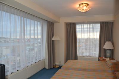 4名1部屋のプランで泊まったのですが、エレベータから最も遠いスイートを思わせる部屋で、角部屋のリビングルームとベッドルームそれぞれにベッドが2台ずつ。洗面台とトイレもそれぞれにありました。ツインにエキストラベッド&ソファベッドの可能性もあると覚悟していたので、大感激でした。電動カーテンには昭和を感じましたが、空調も静かで快適でした。