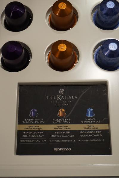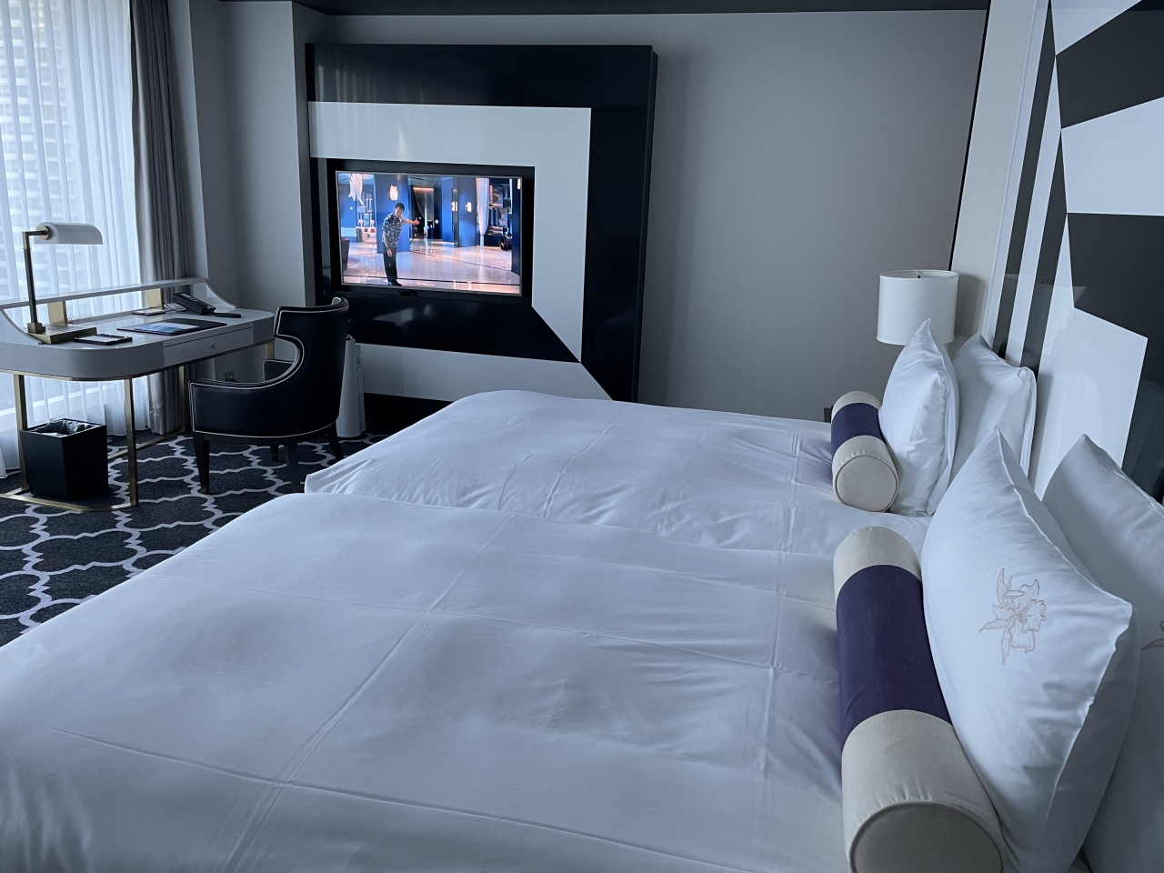 部屋は8階のグランドツインルーム(47㎡以上)。カードキーで入ると、室内からはウェルカムBGMとしてのハワイアンミュージックが! 一気にテンションが上がりました。部屋は130cm幅のセミダブルベッド2台でもゆとりを感じる室内ですが、奥にはウォークインタイプのクローゼットがある他、それぞれのベッドサイドからトイレや浴室・シャワールームへアクセスできるよく考えられた造りでした。洗面台もゆったり2台が並んでいます。クリスタルモダンをデザインコンセプトに意匠を凝らしてあるとのことで、清々しい光を反射する輝きに満ち溢れたエレガントな空間です。アメニティも充実しており、ラグジュアリーなソファも置かれているのですが、背もたれが右半分にしかない素敵すぎるデザインで、時々後ろにひっくり返りそうになりました(笑)。大きな窓があるものの、8階はやや高さがないので景色は眼の前のパシフィコ横浜ノースの屋根部分に一部遮られるのですが、それでもベイブリッジから観覧車コスモクロックまでを見渡せます。
