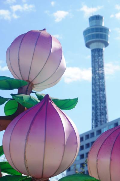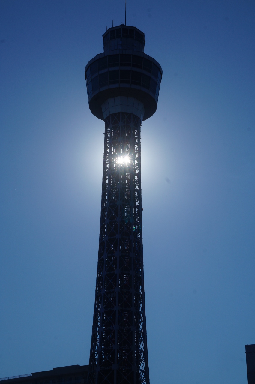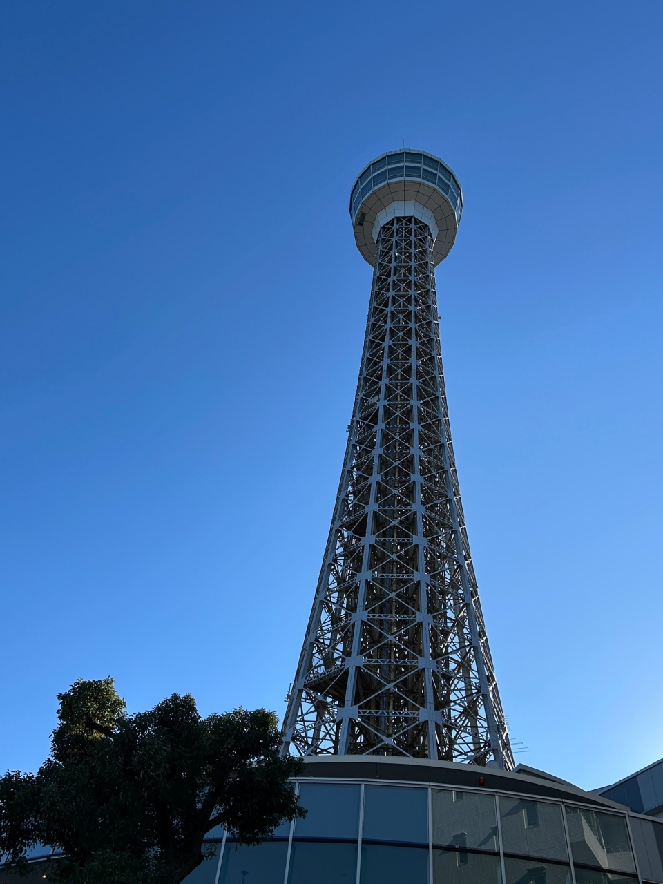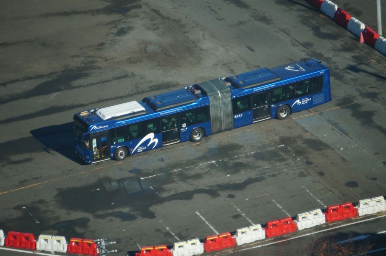横浜駅前(東口バスターミナル)から来た「山下ふ頭」ゆきに「パシフィコ横浜ノース」バス停から飛び乗りました。乗るなら2両目の前方がオススメです。列車とは異なり90度の右左折をするので、1両目部分が見たことのない動きをします。必見です! 市の中心部を走り、「大さん橋入口」の次の「山下公園前」バス停で下車するとマリンタワーは眼の前です。