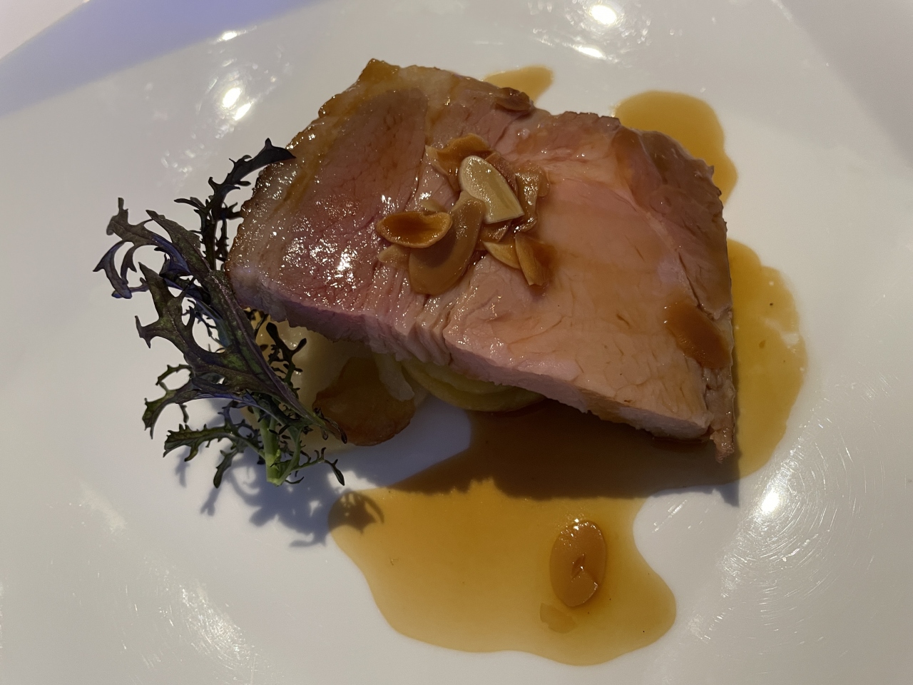 肉料理は、千葉県産茶豚ロース肉の真空調理 アーモンドソース。なかなかのボリュームでしたが、焼いた時に引き出される豚肉の魅力が今ひとつ感じられなかったかも知れません。