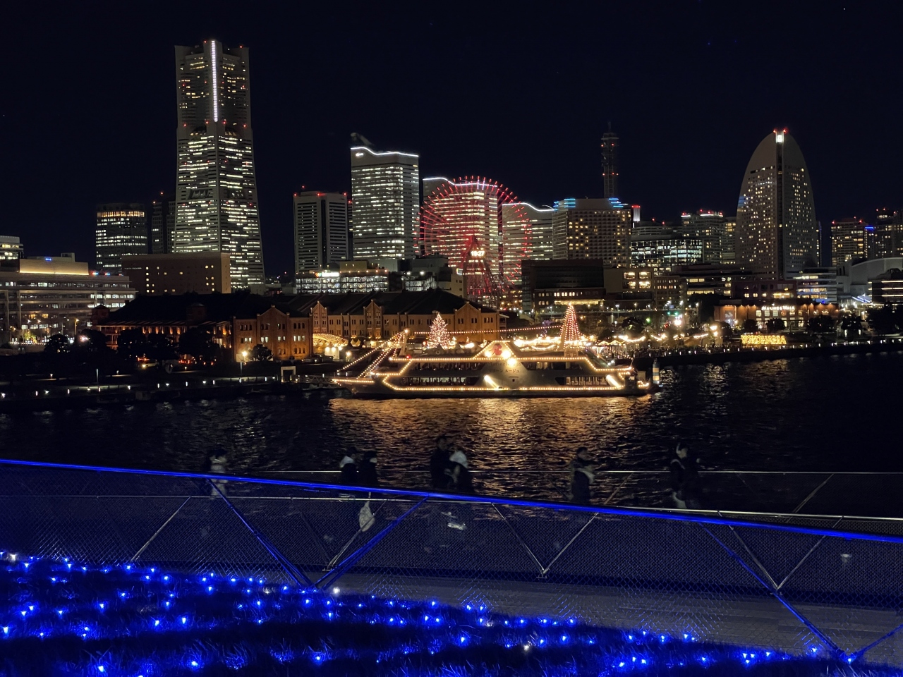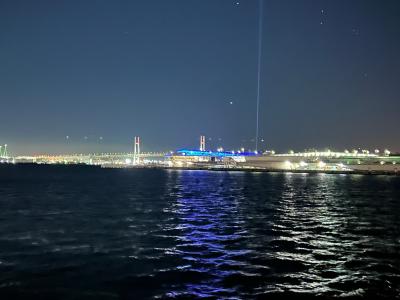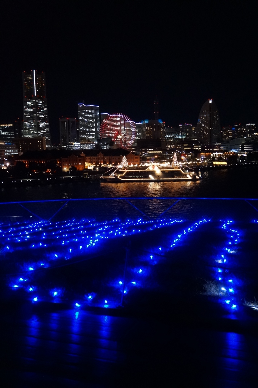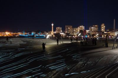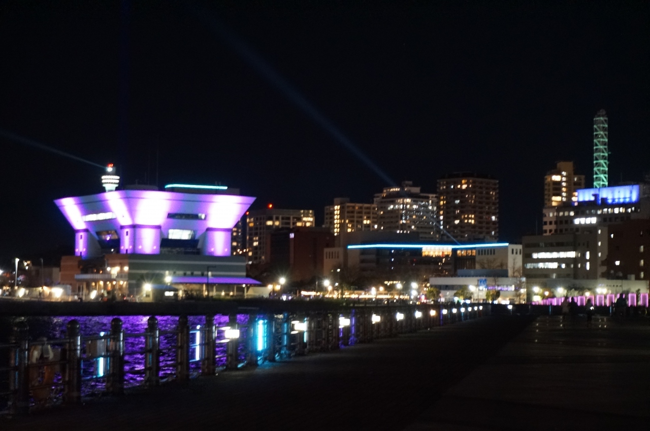 赤レンガ倉庫前を歩いていると00分になりました。「ハイライト・オブ・ヨコハマ」という5分間のショーの始まりです。みなとみらいから山下公園までつながる横浜の街全体が光と音で躍動するスペクタクルショーとの触れ込みでしたが、香港で観た「シンフォニー・オブ・ライツ」をイメージしていたので正直なところちょっと拍子抜けではありました。音楽がシンクロしていないのも大きな理由かと思われました。それでもインターコンチネンタルホテルのてっぺんやマリンタワーなどいくつかの建物からレーザーが空に向かって照射されたり港の施設がリズミカルに色を変えたりとパノラマの中で素敵な演出がなされていました。