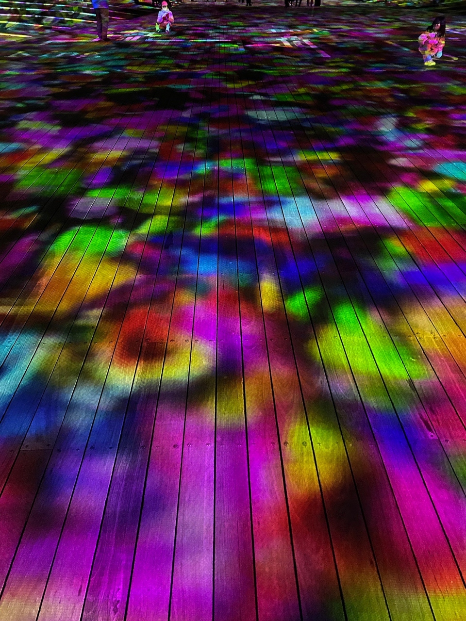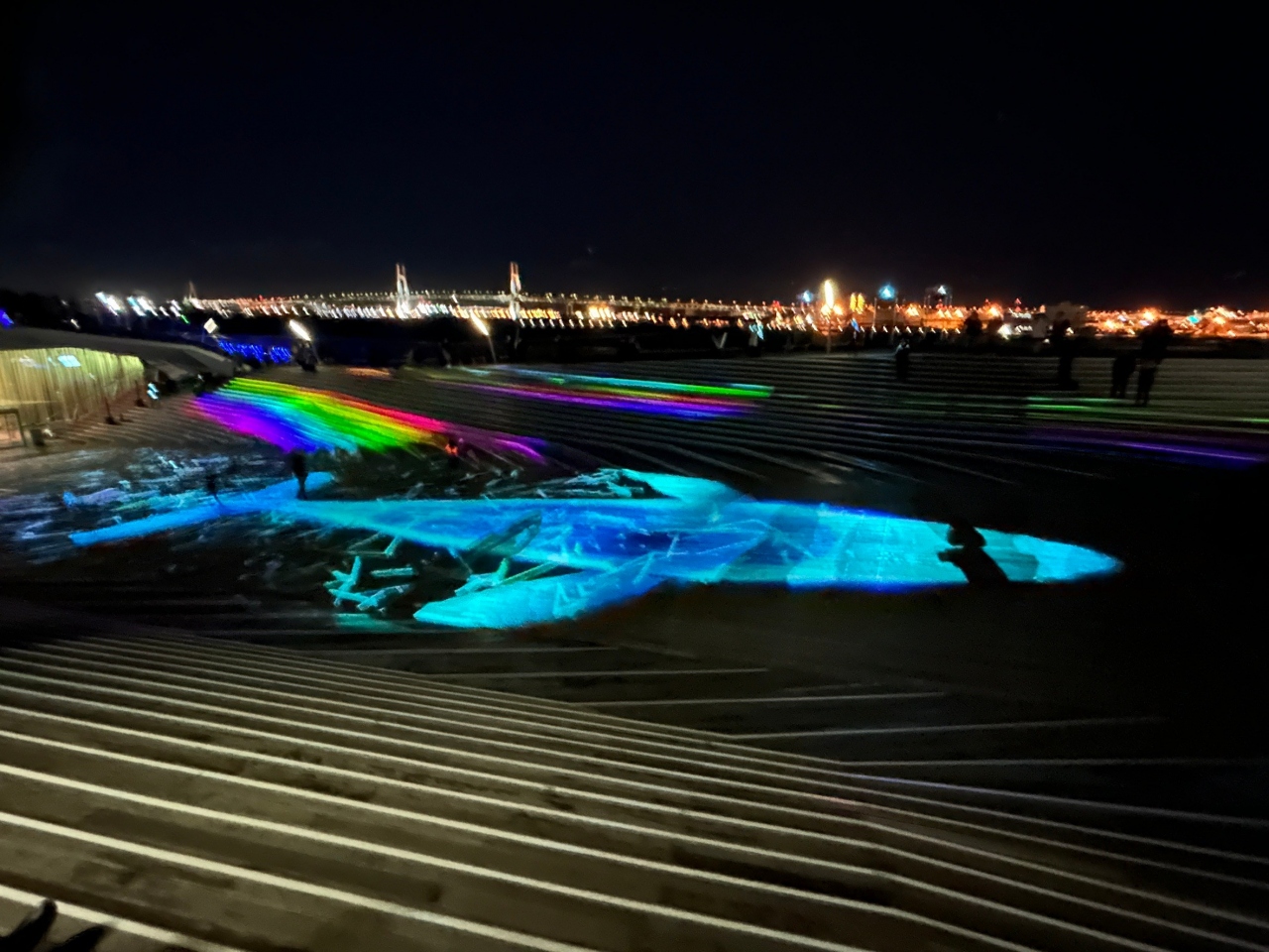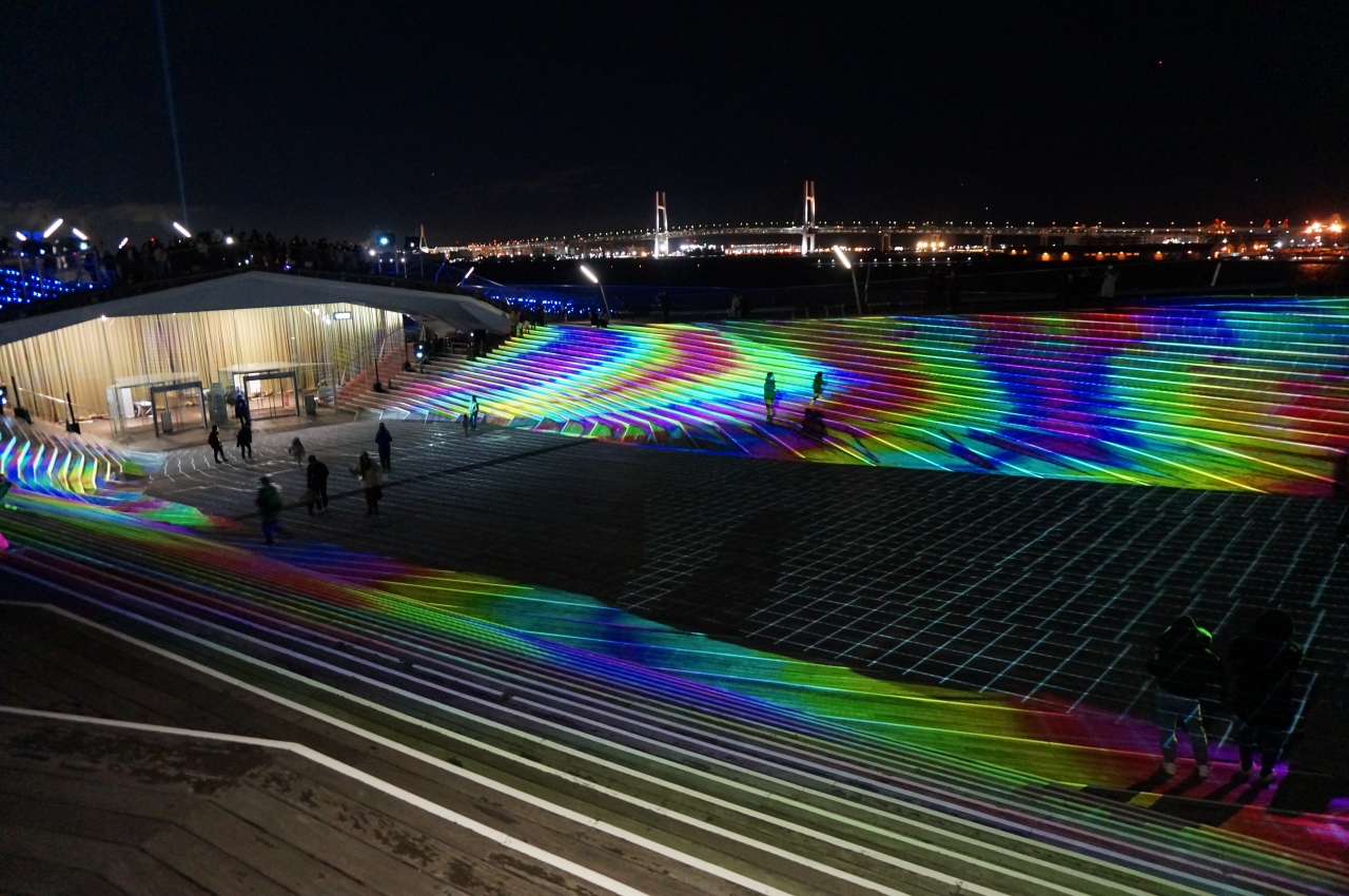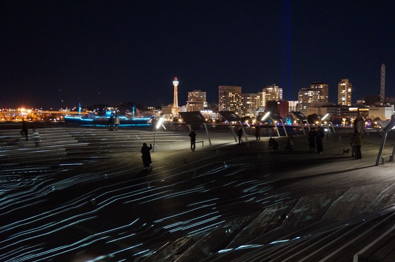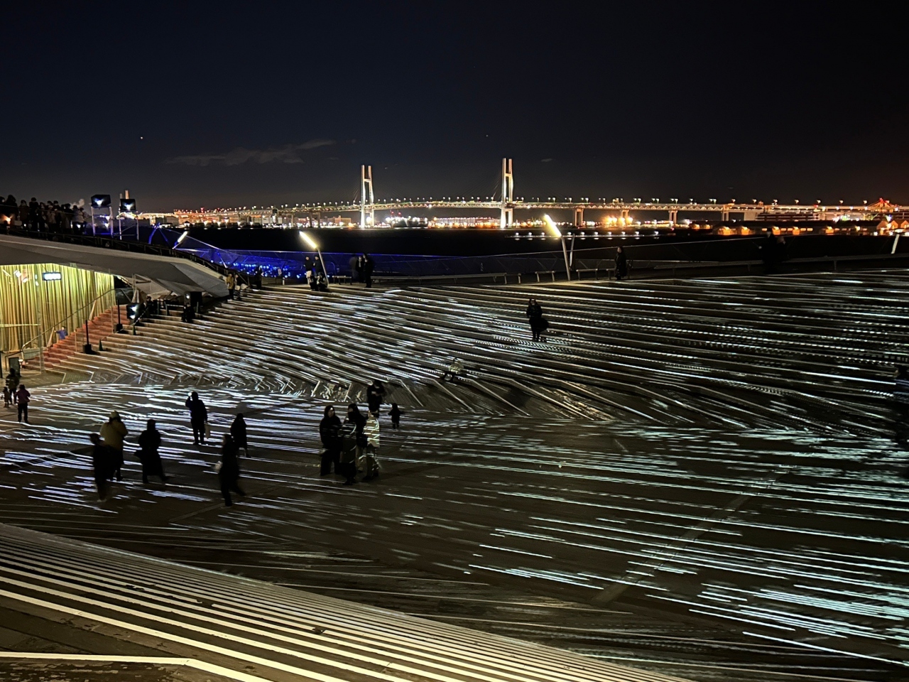 目的地である国際客船ターミナルの屋上、通称「くじらのせなか」に上ると、吹き荒ぶ風が厳しいのですが、北九州・長崎と並んで日本新三大夜景都市に選ばれたという横浜でもこれぞザ・ヨコハマという光景が広がります。そのうちにLEDイルミネーションに流れる音楽が変わりました。そう、先ほどから30分経ち、「ハイライト・オブ・ヨコハマ」の5分間が始まったのです。みなとみらい地区と山下公園方向は分断されてはいるものの、此処では音も連動して、さっきよりも感動的なスペクタクルショーとなっていました。そして! ショーの終了を待ってか、屋上広場では日本最大級の参加型屋外プロジェクションマッピング「大さん橋くじら座」が始まりました。波打つようなウッドデッキに広がる光の中に入って行くと大河に飛び込んだような、もしくは演出の一部になったような心持ちになります。くじらの親子も登場し、子どもたちが走り回って追いかけていました。