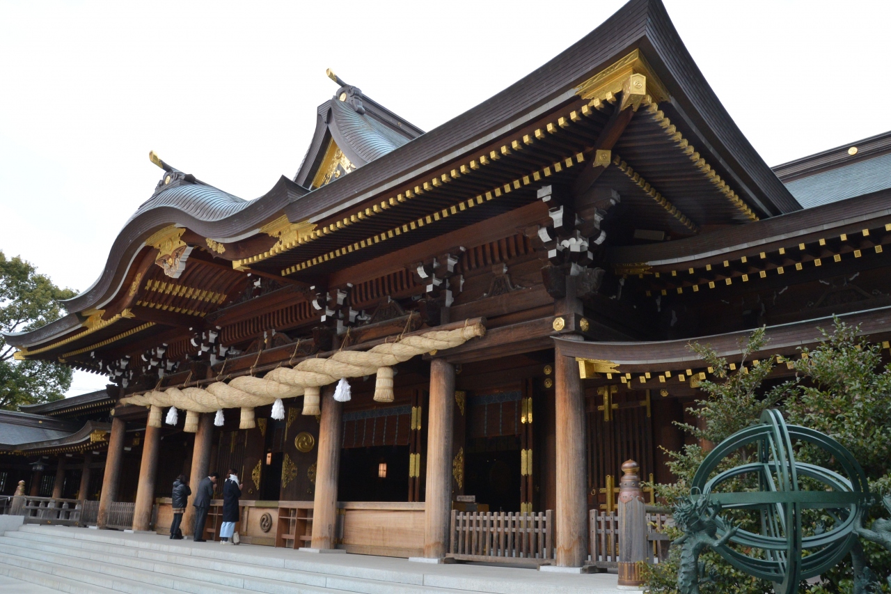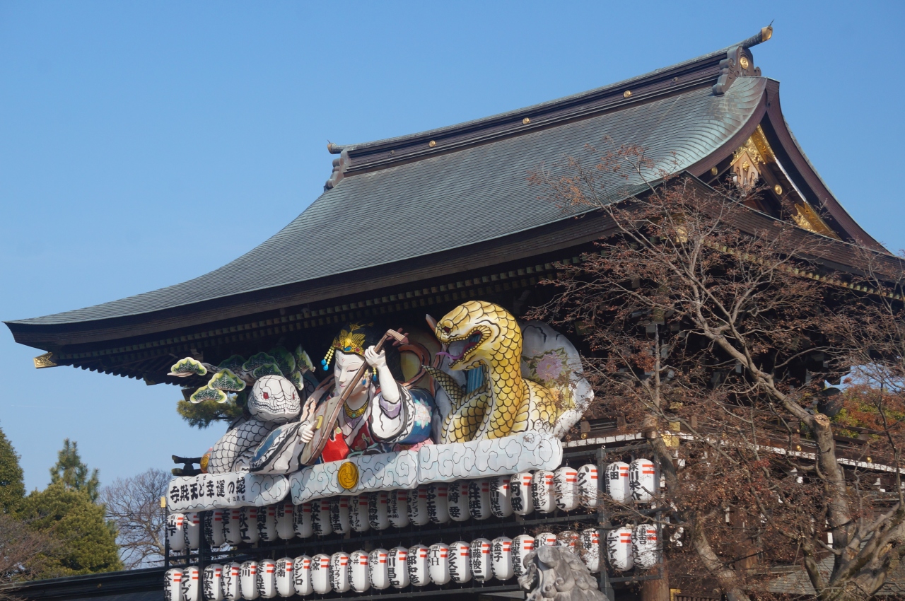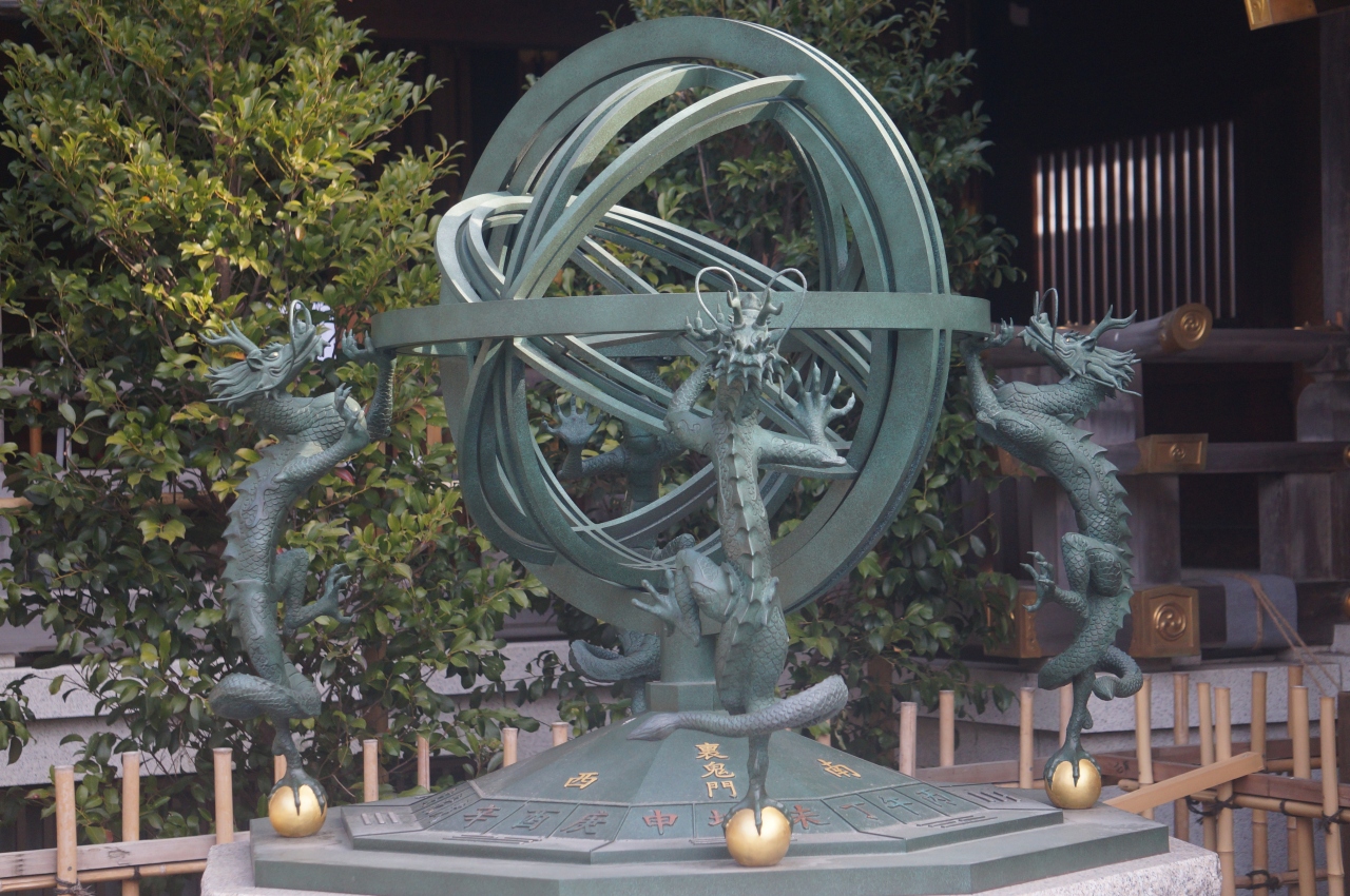 相模國一之宮として有名であるほか、全国唯一の八方除けの守護神として古くから信仰されてきた神社です。拝殿の右手前には、天体の位置や星などを観測する器具である渾天儀が置かれており、龍は天空を支えるという故事にならい四隅に龍が配置されています。