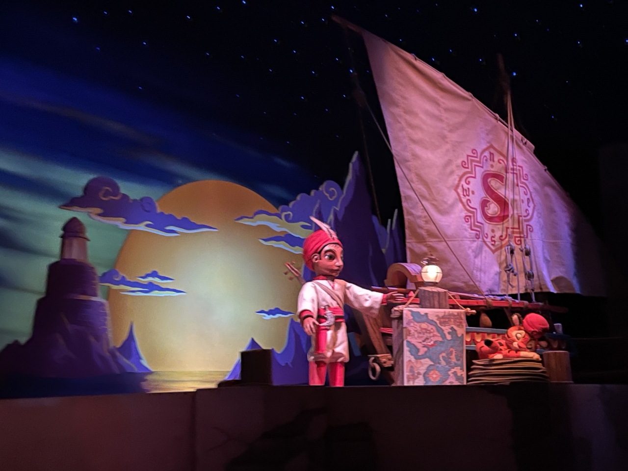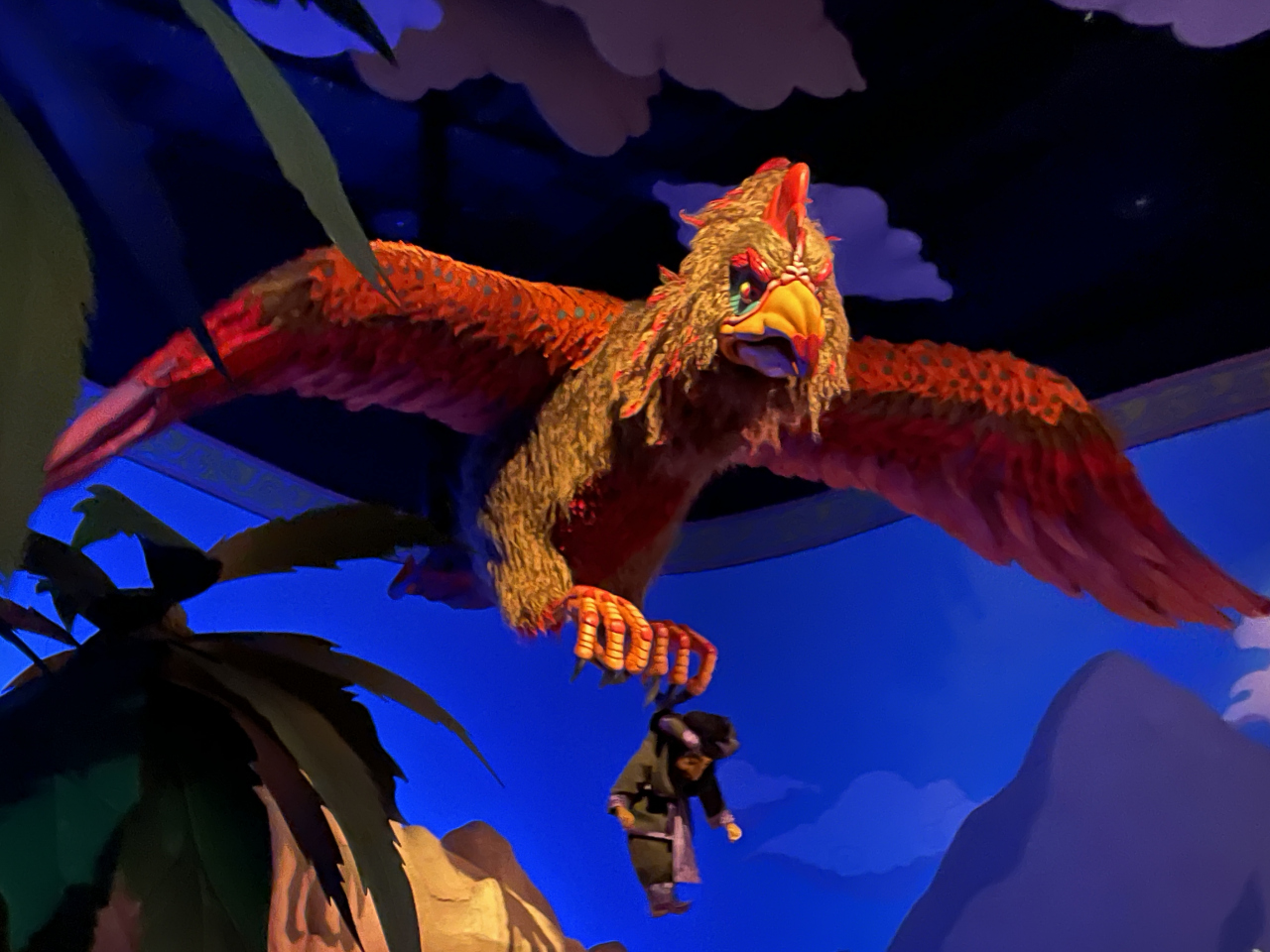 歩き疲れた時に助かるボートの旅です。オープン以来の展示内容には時代に合わせての変遷があり、現地人である巨人や猿たちの乱暴さの描き方が変わっています。今はシンドバッドが「みんな演奏がすごく上手だね!」なんて褒めちゃってます。