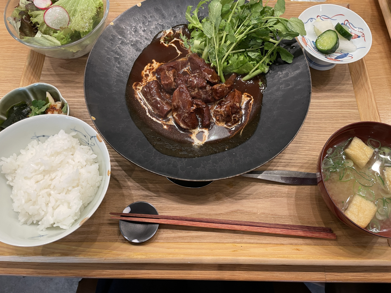 私は牛タンシチューの定食を注文しましたが、形を保っていながら箸でホロっと崩れるタンが絶妙です。ソースも味わい深いものでした。皿には多めのクレソンが添えられているのですが、苦手な家内もこのソースをまとわせると美味しくいただけるようで、牛ステーキに添えられていたクレソンを私のシチューにつけて食べていました。