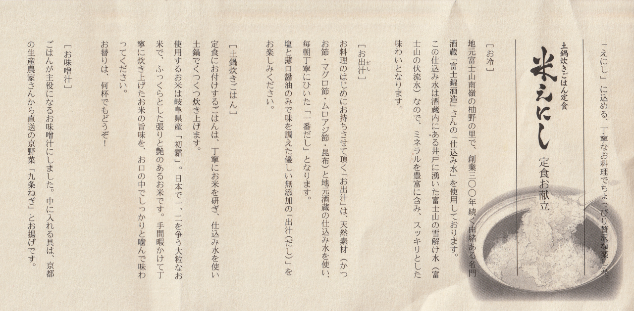 まず供された「お冷」は、清酒富士錦の仕込み水だそうです。富士山の恵みとしての伏流水は、スッキリと美味しい水でした。
