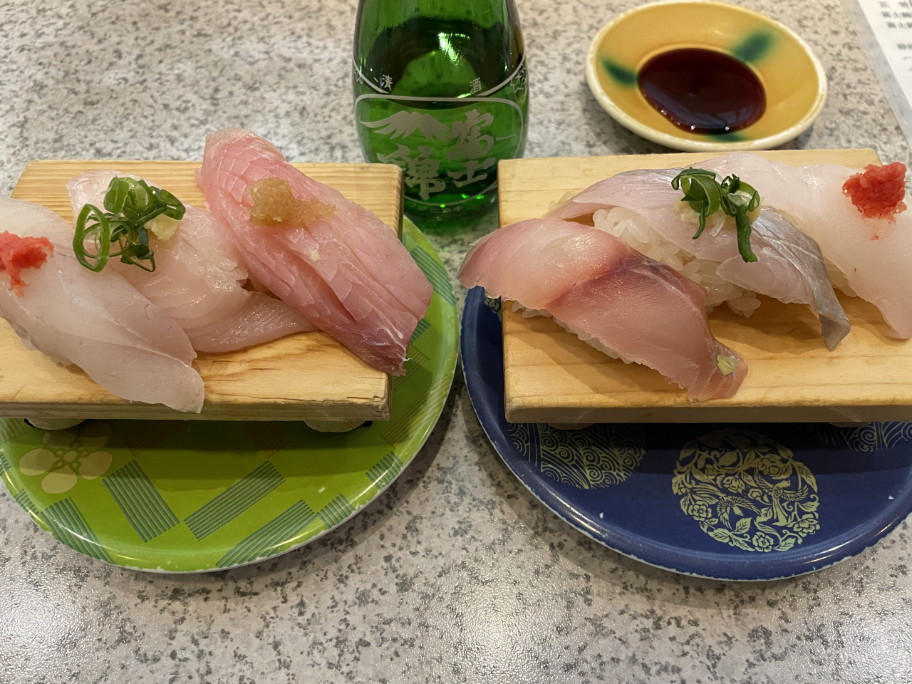 田子の浦港から北上する港大通り沿いの富士中央公園近くにある地元の回転寿司店です。これといった特徴がないように思えるのですが、富士市に来て何か食べようとなると入店しているところからすると、魅力があるのだと思います。実際、平日の夕方でしたが、ボックス席はファミリーで満席で、私たち夫婦はカウンターに通されました。