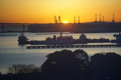 翌朝は仕事がある日と同じくらいの5時台に眼がさめてしまいました。暫くウトウトとしていましたが、6時まではもたず、カーテンを少し開けてみたくなりました。こういった時に普通ならベッドから下りて歩いて隙間から外を覗きに行くのですが、ベッドサイドに電動カーテンのスイッチがあるので横になったまま少し開けてみることができました。ベイブリッジ方向の空が赤みを帯びて来ているようでした。そしてしばらくすると、いわゆるご来光を拝めました。