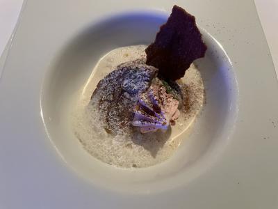 前菜は、ポワローヴィネグレットに見立てた長ネギ 鶏ムネ肉のスモークを添えて オレンジとビーツのクーリーソースでしたが、ビーツ色のクーリーソースよりもむしろ、オリーブオイルと白ワインビネガーをマスタードで乳化させたヴィネグレットソースが実にネギと鶏ムネ肉の味を引き立てていて私は気に入りました。