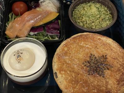 実際には11時半頃に入りました。「モバイルオーダー」で予約しておいたのでカウンターでの受け取りはスムースだったものの、ランチタイムの始まりの頃ということで、座席を見つけるのに難儀しました。注文しておいたロイヤルセット(3,500円)では、私はメインディッシュにオマール海老と赤魚のパイ包み焼き、家内はビーフシチュー風のパイ包み焼きを選択してありました。スモークサーモンサラダ、ポテトグラタン、パン、オラフのマシュマロココアムース、コーヒー・紅茶などが付くセットです。シーフードは私の好みの味であったこともありますが、おすすめだと思います。- 旅行時期