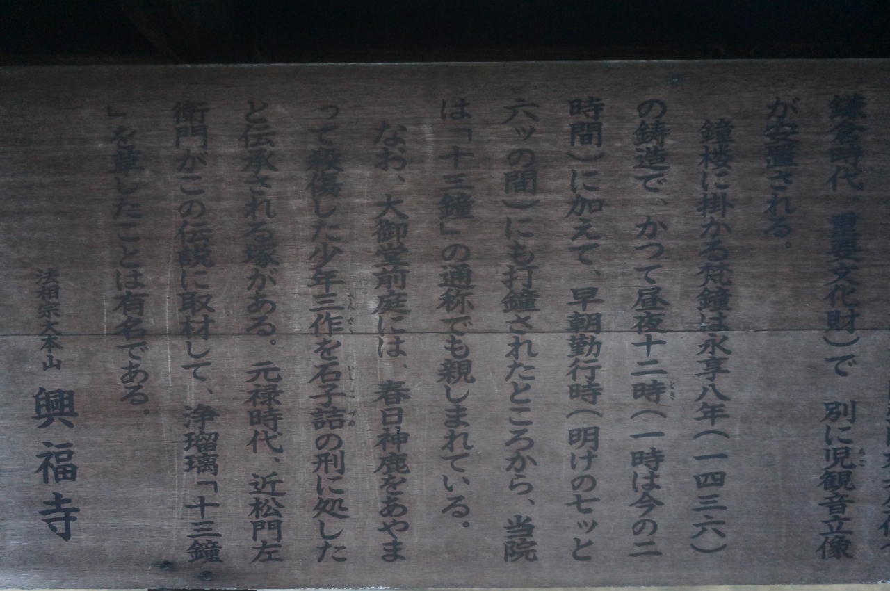 ところで、石子詰(いしこづめ)になった三作(さんさく)少年のお話はご存知でしょうか。昔興福寺の寺子屋で習字をしていた三作という小僧のもとに鹿が現れ、半紙を食べられそうになったのでとっさに三作が文鎮を鹿に投げつけたところ、急所に当たり鹿は死んでしまったそうです。神の使いとされる鹿殺害の罪は穴に石で埋められる石子詰刑罰と定められており、三作少年もこの刑で死罪となりました。母親が興福寺菩提院大御堂の鐘をついて供養に努めたということで、その前庭には三作の塚とされるものがあります。小学生の頃この話を聞いて、まちで出会う鹿は大事にしないとエラいことになる!と幼いながらも思ったものです。菩提院大御堂にも今回手を合わせました。- 旅行時期