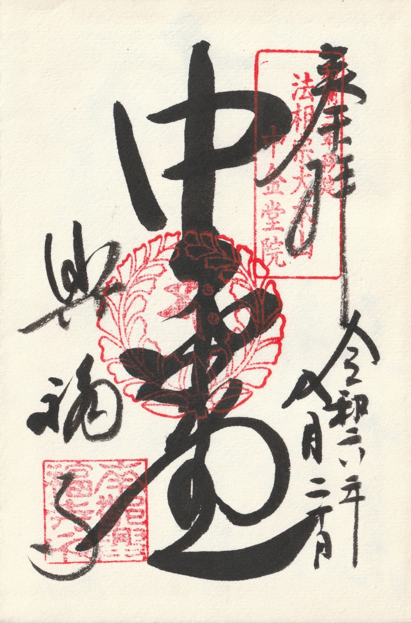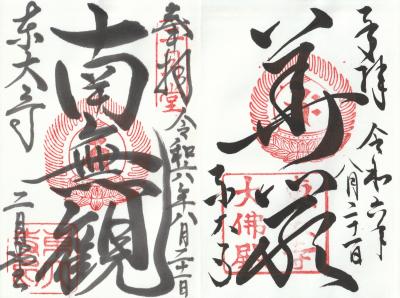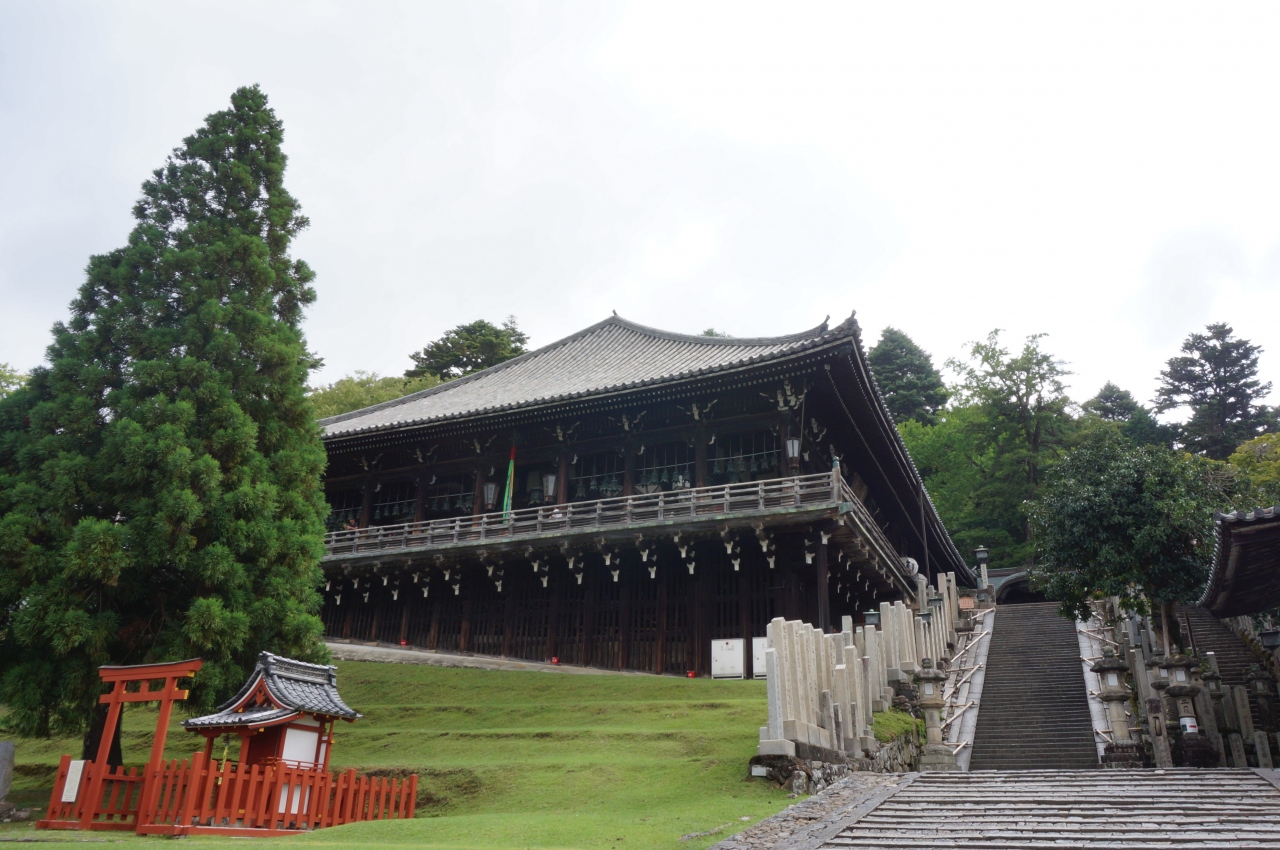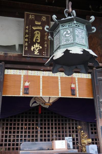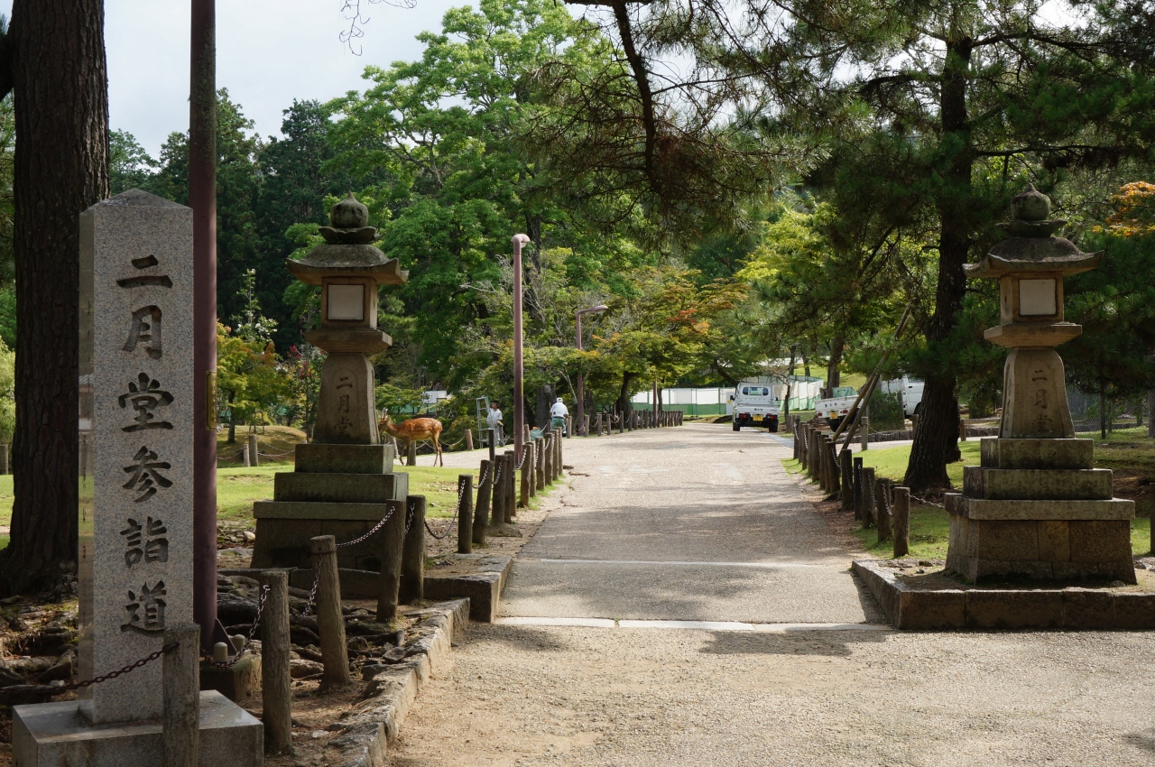 三月堂の北隣には「お水取り」で有名な二月堂がそびえています。石段を頑張って昇って二月堂から下を眺めると、眼の前には東大寺を開山した僧正の名を冠した良弁(ろうべん)杉が立ち、その向こうに奈良のまちがひろがっています。御朱印は南側に向き合う建物でいただけます。- 旅行時期