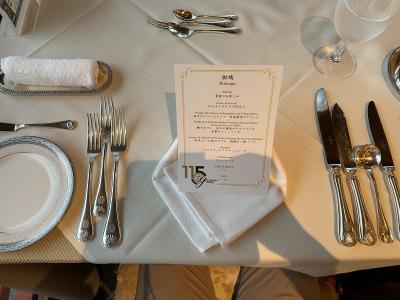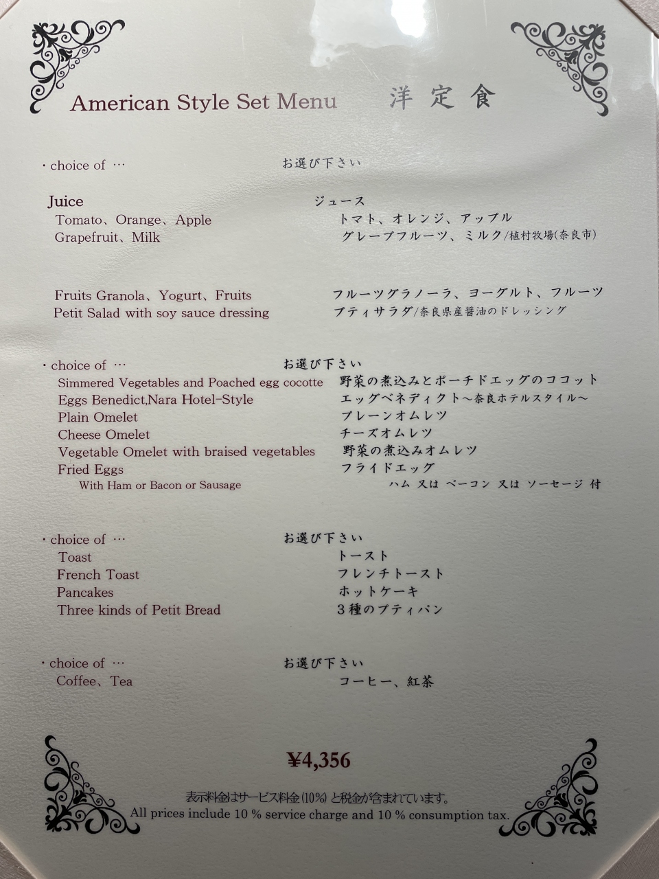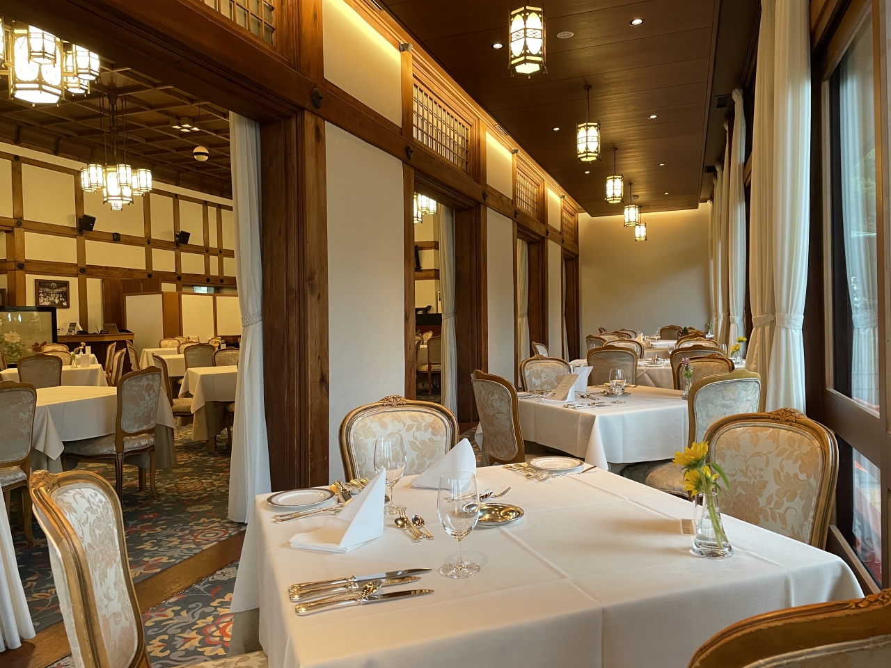 かつて市内今御門町に暮らしていた高齢の母が、奈良ホテルのメインダイニングでもう一度フランス料理を食したいとのことで、母の奢りで二泊連続での夕・朝食をいただきました。一歩中に入ると、明治・大正時代にタイムスリップしたかのような、それでいて他のクラシックホテルより明るい空間がひろがっています。初日は興福寺が見える外側の席、二日目は母の希望で天井の高い内側の席を用意していただきました。