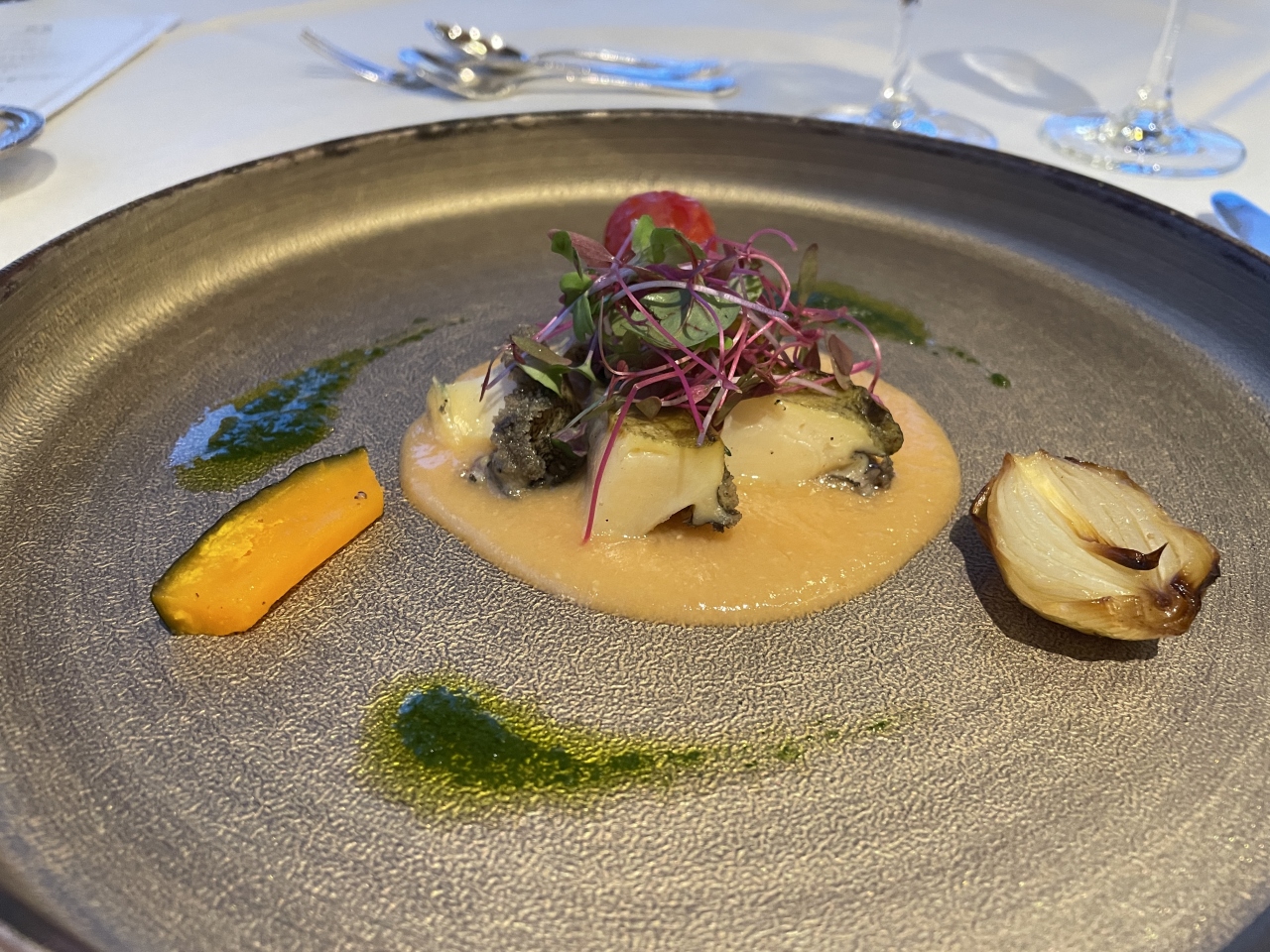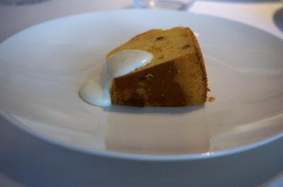 マドレーヌ形のふわふわのパンも珍しいのですが、シフォンケーキも登場。さすがに?となったところで「シフォンサレ」という玉ねぎも生かした塩味のシフォンと説明され納得。サワークリームとの相性も抜群でした。此処は他のレストランではお目にかかったことが無い品が供される驚きがあります。