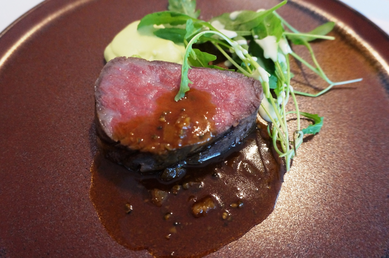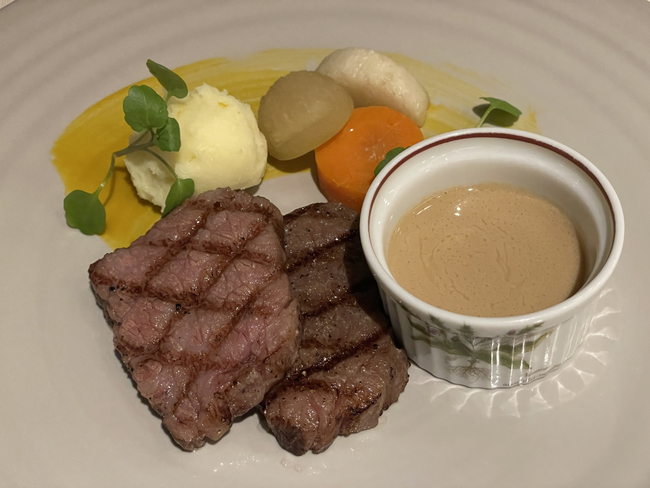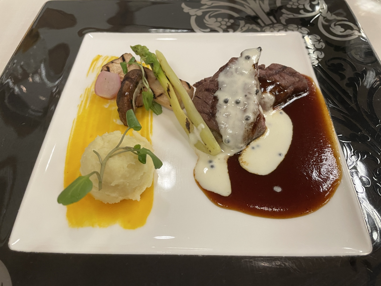肉料理は、初日が「和牛ロース肉のグリエ 胡麻ポン酢ソース」でした。和牛は近江牛とのことで、最上級の味わいでした。二晩目は「和牛ヒレ肉のグリエ キャビアソース」でしたが、こちらも口の中でほどけて行く柔らかさでした。