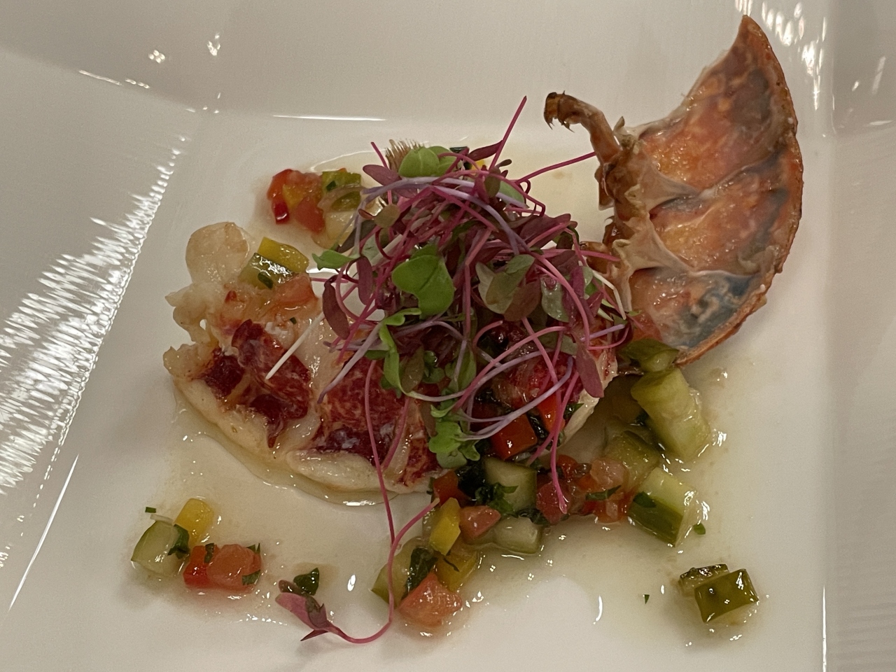 魚料理は、初日が「鮑のポワレ 白みそ風味のトマトソース 大葉のジェノベーゼ」でした。白味噌とトマトソースの組み合わせには不安もあったのですが、これが最高のマリアージュでした! 二晩目はオマール海老が登場。アワビとオマールという高級食材をいただけました。