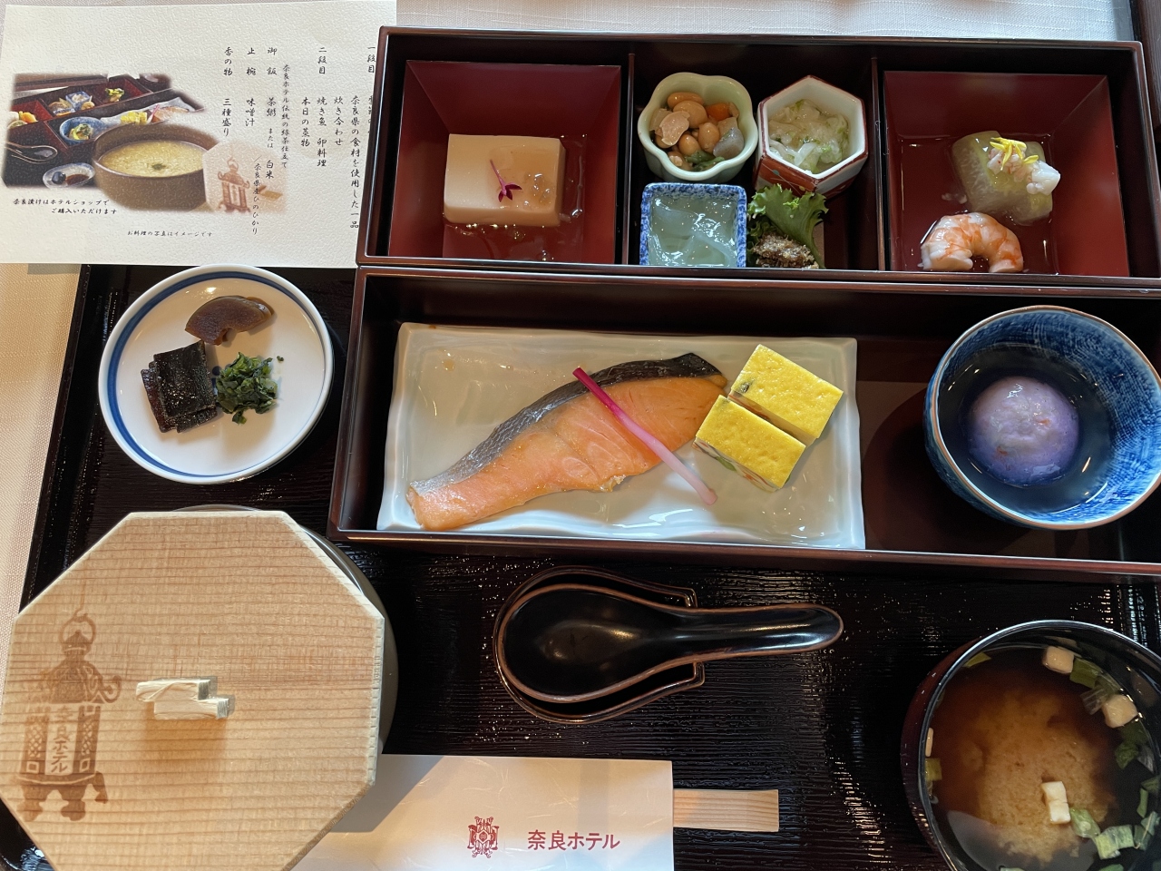 夕朝食をいただいたメインダイニングルームでのひとときは夢のようでした。一歩中に入ると、明治・大正時代にタイムスリップしたかのような、それでいて他のクラシックホテルより明るい空間がひろがっています。初日は興福寺が見える外側の席、二日目は天井の高い内側の席を用意していただきました。シャンパンと共に「斑鳩」というディナーをいただきましたが、ほとんどのメニューが2晩異なるものを用意してくださるなど、素晴らしいホスピタリティでした。中日の朝にいただいた和定食は茶粥をチョイスしましたが、添えられていた奈良ホテルオリジナルの奈良漬けもマイルドに仕上がっており、ホテルショップで自宅用に購入したほどでした。