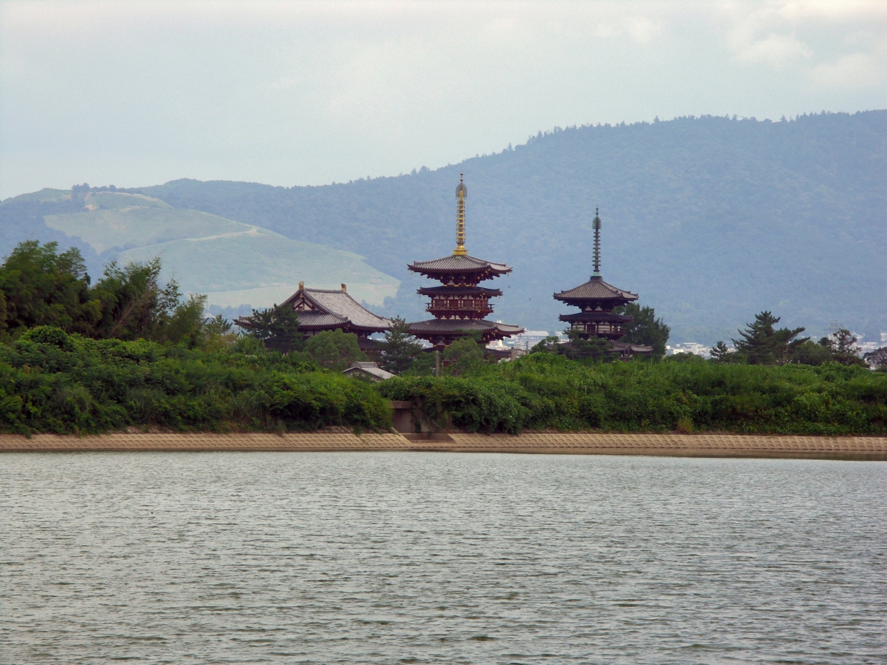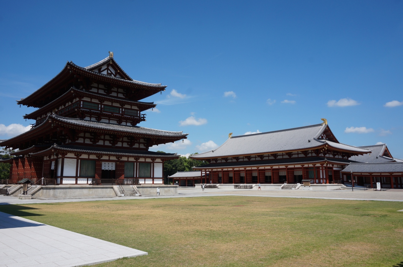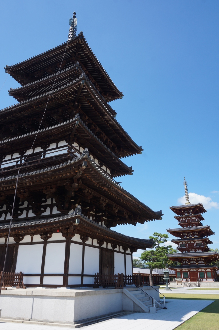 私が小学生の時に管主だった高田好胤和上が、写経勧進による白鳳伽藍復興を始めたというニュースを見た覚えがあります。一巻千円(当時)の納経料をいただくことで百万巻の写経を勧進してまずは金堂復興を目指していましたが、全国を行脚する高田管主を揶揄する声も聞こえ、子ども心に「ひどいことを言う人がいるなあ」と感じていました。私が高校に上がった頃、やっと目標の百万巻を達成し金堂が落慶されたのでした。現在は、西塔(さいとう)、中門、回廊、大講堂、食堂(じきどう)と白鳳伽藍の主要な堂塔はおおよそ復興され、いにしえの大伽藍がよみがえっています。フェノロサが「凍れる音楽」と評したと子どもの頃に聞いた時には「???」となった東塔でしたが、新プロジェクトXでの表現を俟つまでも無く、「大小の屋根がリズミカルに重なり合い空へとのびゆく」立ち姿や「美しい旋律を思わせる」その姿に、唯一無二の貴重さを感じることが出来ました。信仰の要である心柱の修理も前代未聞の工法で無事に終えられ、そんな苦労は微塵も感じさせないように、1万3千の当時の部材の9割を活かしたいにしえのままの姿で建っていました。