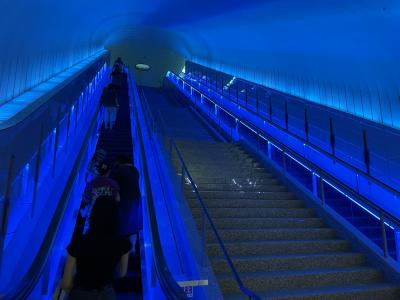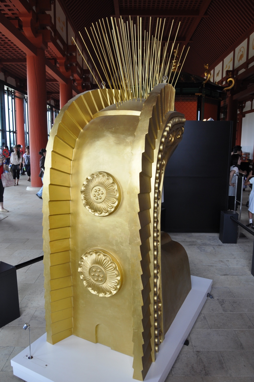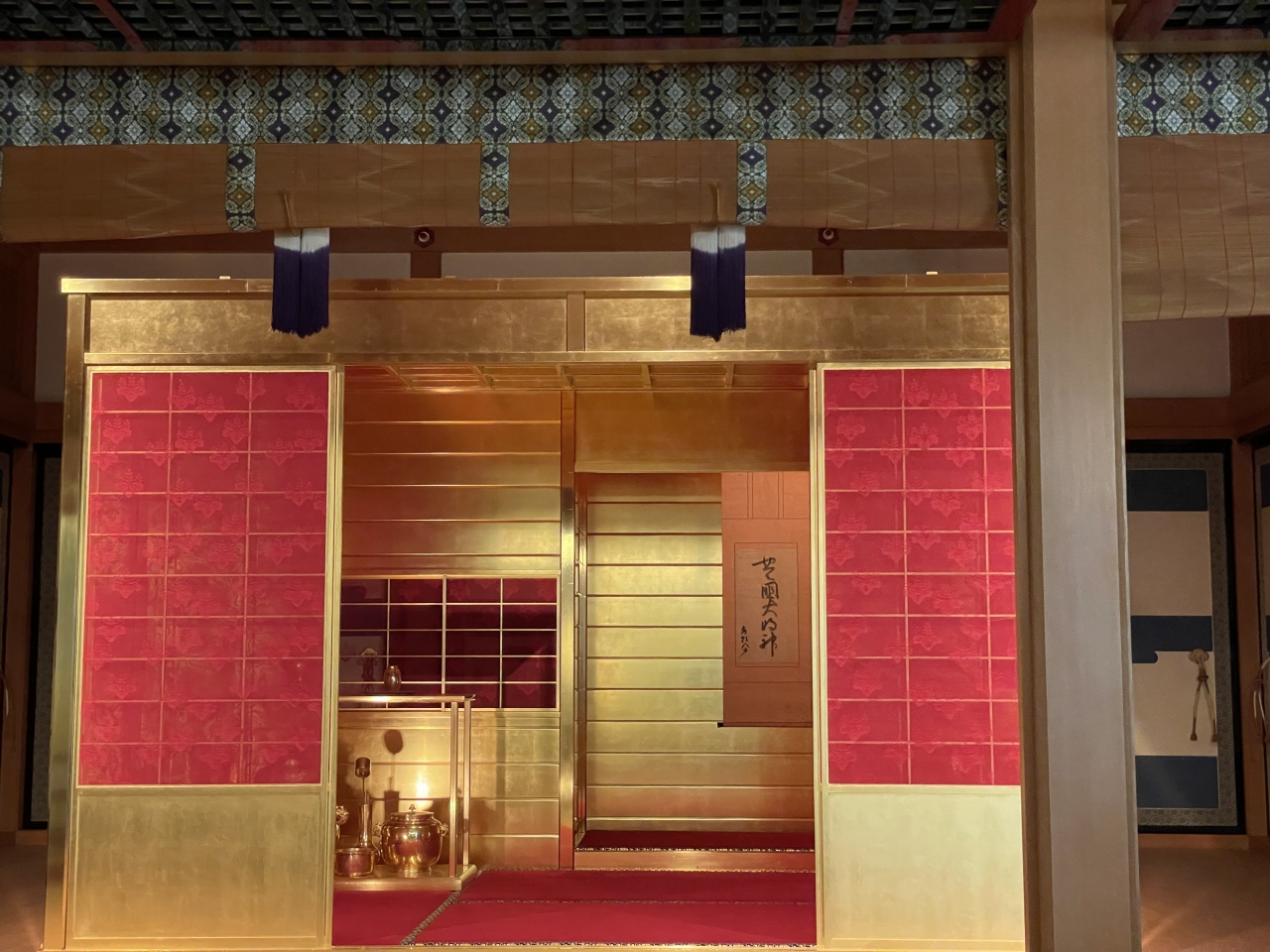 エントランスから宇宙につながるかのようなエスカレータを何本も乗り継ぎ、企画展の入口に到着すると、案内誘導の不手際もあって少し混乱していましたが、識別のリストバンドを着けた私たちはお蔭さまで優先入場列(ファストパス列のようなもの)につくことが出来ました。通常入場列(スタンバイ列)は、優先入場の3分の1程度の進み具合のように見えました。途中、列から外れて黄金の茶室も見学させていただけました。やはり此処に来た限りは見ておいた方が良いと思います。