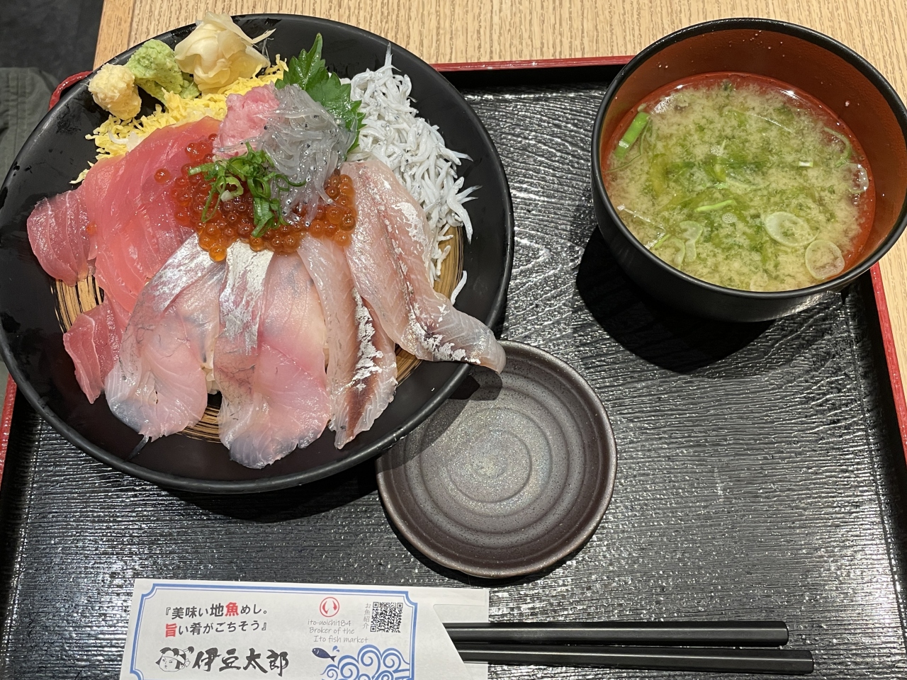 私が注文した地魚海鮮丼は人気No.2だそうで、伊豆の地魚や近海ネタ、生しらす、生桜海老、伊東の釜揚げシラスなどを盛り込んだ仲買人の海鮮丼でした。また、家内は人気No.1という海鮮のっけ丼を注文。2枚以上あるネタを交換しつつ贅沢に楽しみました。カマスが特に美味しかったです。- 旅行時期