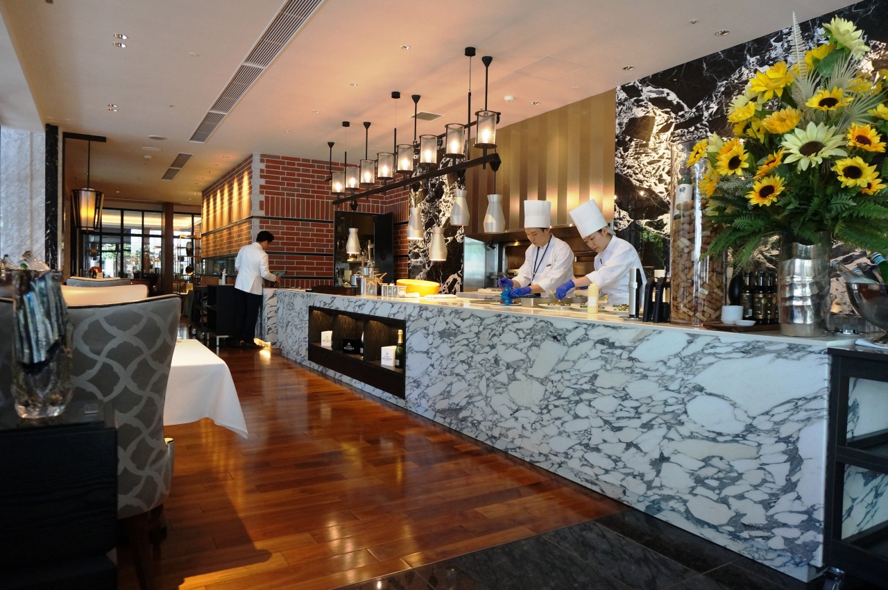 入ってすぐに左側に連なるライブキッチンを彩る大理石が眼を惹きます。ローマ時代の建物に使われていたイタリア原産の希少なピアノフォルテを採用しているそうです。