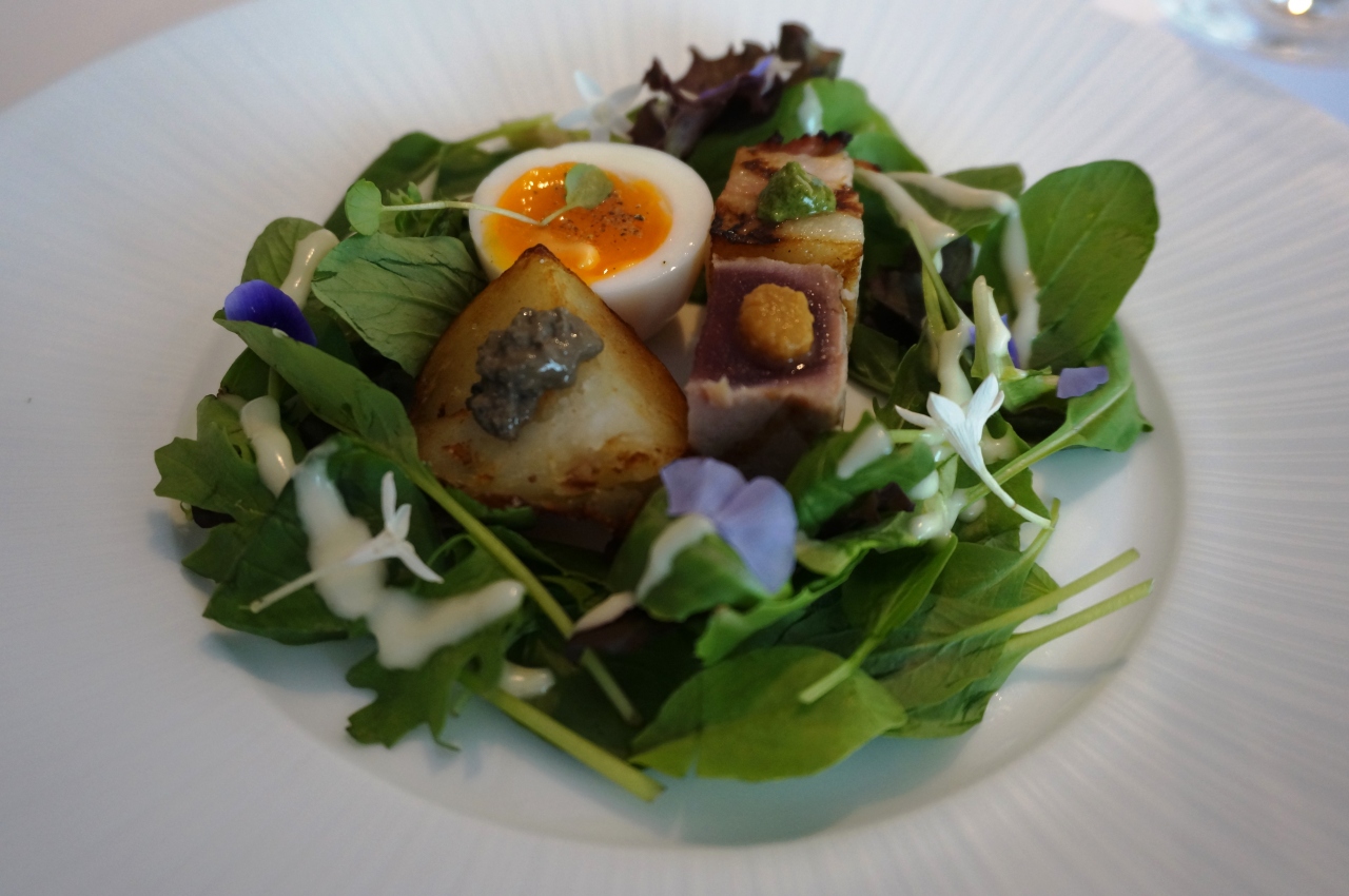 前菜として出て来た「サラダニソワーズ」は、ほど良い脂身のイベリコ豚や黄身の濃いゆで卵などがトッピングされた美しいサラダですが、炙った鮪が特に絶品でした。