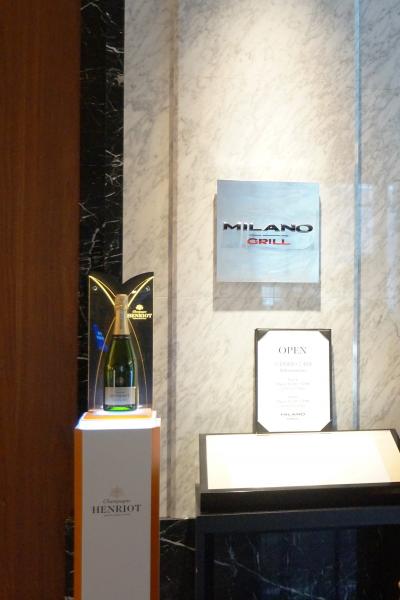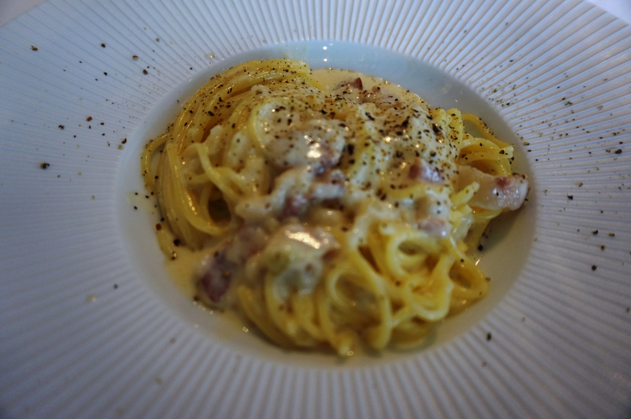 フレンチ風のメニューが続きましたが、やはりミラノといえばパスタでしょう。「カルボナーラ スパゲッティー」はライブキッチンに置かれた大きなチーズの器の中で細めの麺を絡めて仕上げていました。パスタの量は私たちがお願いした100gの他に50gと150gが選べました。