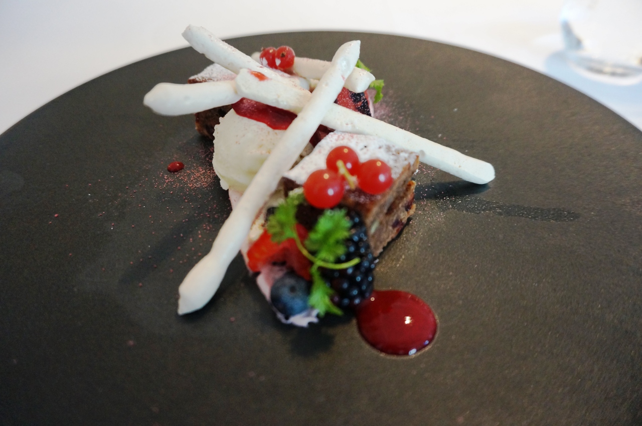 デザートは硬めのケーキのようなブラウニーとバニラアイスにいくつかのベリーがトッピング。結構お腹一杯になりました。コーヒーの他にドイツのロンネフェルト紅茶も選べました。