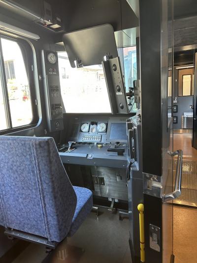 新造車両なのでピカピカでテンションが上がりますが、車内にもいくつかポイントが! 各車両の通路からデッキへ向かう扉上にあるフルカラー液晶ディスプレイには、走行装置の使用状況を図示する機能もついています。またデッキには沿線地域の伝統工芸品を鑑賞できる「ナノミュージアム」も設けられています。高山止まりの4号車と富山まで行く9号車との間には運転台もあるので萌えポイントでもあります。車内チャイム「アルプスの牧場」の演奏はスギテツのお二人が担当。往年のディーゼル車内で流れていた名曲が現代風にアレンジされて復活しています。