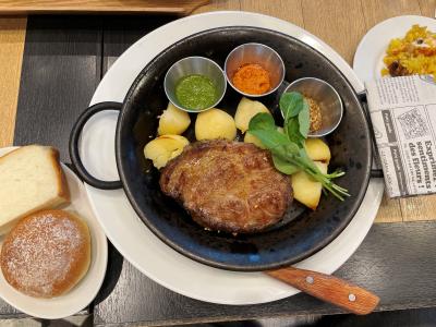 ランチメニューから、私は「イベリコ豚ロースのステーキ」(2,200円)をチョイス。パエリアパンで提供されるポークステーキなのですが、ジューシーな肉質と上品な脂身の甘味が絶品で、250gでもペロリとイケちゃいます。もちろんマ◯リーさんとはお値段が違いますが、さすがの味わいにうなります。3種類のソース(緑はカレーっぽい・オレンジは酸味があってドレッシング的・もう一つは粒マスタード)が添えられていますが、私はそのまま味わうのが一番好きでした。 2種のパンが付いているのですが、食パンも耳まで美味しく、前述のソースも活躍してくれました。