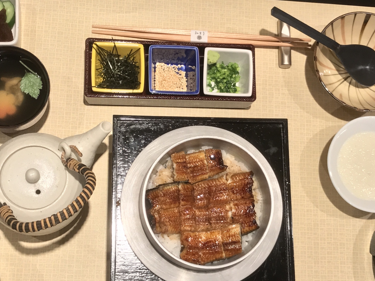 焼き上がるまで35分ほどかかると言われたのですが、鰻が隠れた茶碗蒸しを頂きながら家族の会話も弾み、待たされた印象無く料理がやって来ました。ひとり一人「う」と彫られた木箱に入った状態で目の前に置かれるので、期待感が高まるというものです。熱々の肝吸にも気を付けながら箱から取り出すと、御重もずっしり。蓋を開けると黄金色に輝く大きめの蒲焼きが登場! ふっくらさといい、タレの上品さといい、私好みの焼き加減です。日本橋の「いづもや」に似ているでしょうか。ごはんに余計にタレがかけられていないのも、気に入りました。奈良漬を含む香の物も、ほのかに香る品のある仕上がりでした。息子の鰻釜も、所謂ひつまぶし以上に愉しめる味わいだったようです。出汁をもらいましたが、しっかり節の香りが立つ、ワザを実感できるものでした。今日のデザートは林檎が感じられる甘すぎないシャーベットでした。