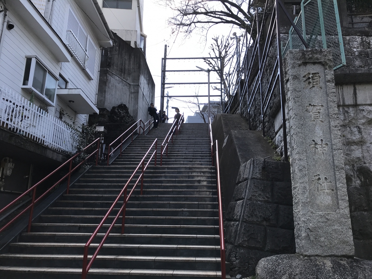 新宿通りのフルーツパーラーフクナガの角に須賀神社参道入口の小さい看板があります。そこを右折して南下すると、外苑スタジオの先にまた看板が。その角を左折すると須賀神社があります。驚くことに神社の入口を素通りしてさらに東へと進んで行く人の数が多めです。その理由は解かっていたのですが、まずはお詣りと思い境内へ。参拝を終えて社務所を見ると窓が閉まり白い布が! ガ~ン、定休日?と思って近づくと、お昼休みを13時まで1時間いただきますとありました。時刻は12時05分(笑) 已むを得ず順序を変更し、表参道の先にある「例の階段」へ。そう、社会現象と言っても過言ではない、新海誠監督の映画「君の名は。」でシーンの舞台の一つとして有名な「聖地」があるのです。高台から記念写真を撮る人たちが列を作り、中国語なども多く聞こえる場所となっています。