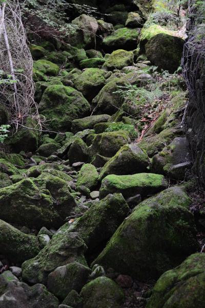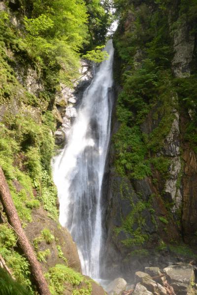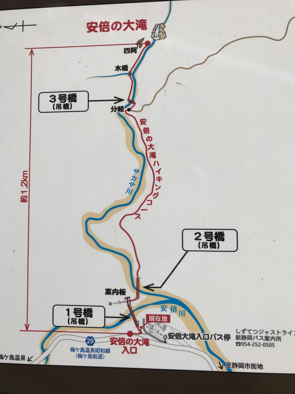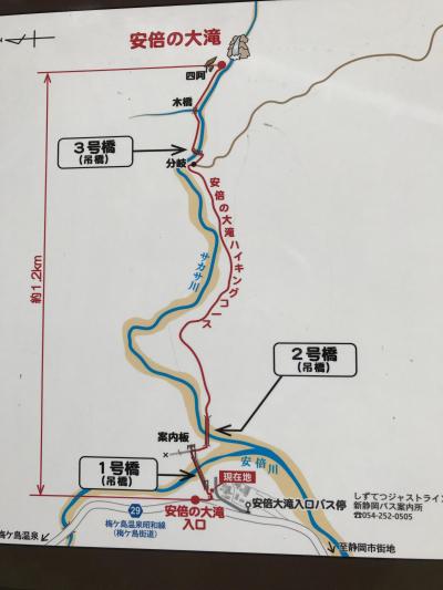 安倍の大滝入口バス停からまずは安倍川に掛かる赤い1号吊り橋を渡りますが、それは序の口!! その先サカサ川を渡る2号吊り橋は、高さがあってグラグラ揺れる上に川の轟音を足下に感じながら進むことになります。高所恐怖症の方でしょうか、進めないで戻って来た方もいました。難所を過ぎても倒木などもあって油断は禁物ながら、サカサ川に沿って登って行く気持ちのよいハイキングコースです。3号吊り橋は最近再整備されたもののようで、安定感のある橋です。その先木橋を渡ると間もなく、突然大滝は姿を現します!