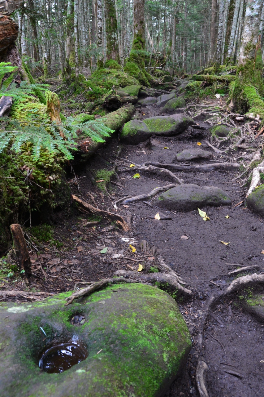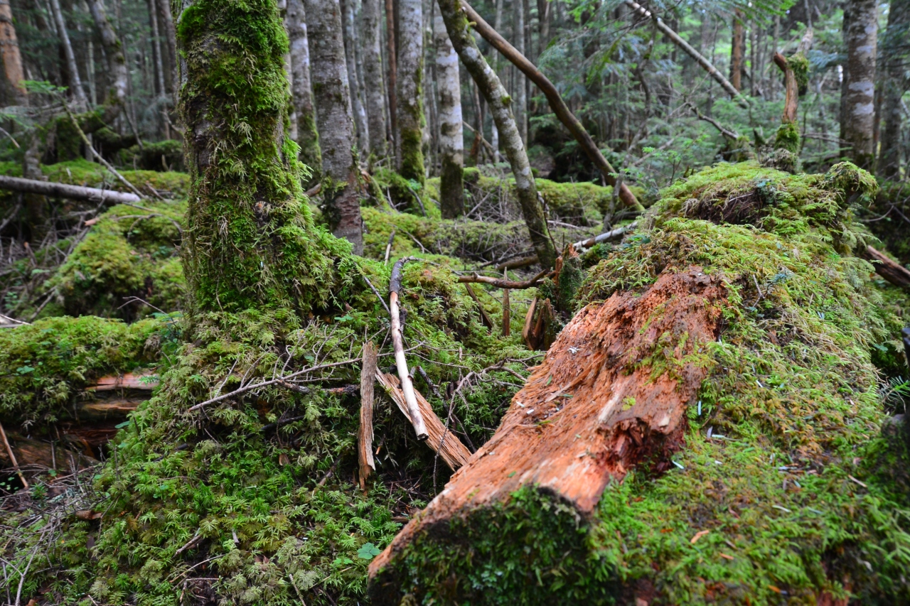 ゲートから白駒の森へなだらかな木の階段を進んでいくと、苔に覆われた森の雰囲気でかなりテンションが上がります。ご高齢の方はこの辺りだけでも見ていただきたい所ですが、その先、右に進む(混雑時は一方通行)と池が現れます。標高2,100m以上の湖として国内最大の天然湖だそうです。池の畔を左回りで周回するルートには「もののけの森」と呼ばれる森がありますが、周回路の途中から山の方へ分かれ、白駒湿原を経て乳(ニュウ)へと登る道に分け入ると、レベルの違う見事な原生林に出会えます。言葉を失う景観です。虫眼鏡(またはルーペアプリ)もあると楽しいです。ただ、木道が完備しているわけではなく、丸太の上を歩いたり足許が泥濘んでいることもありますから、十分な注意が必要です。
