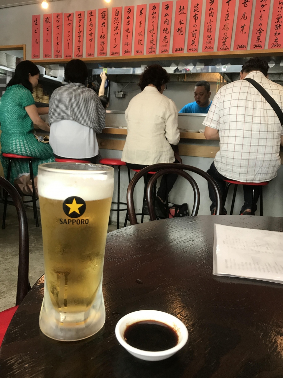 人気TV番組「孤独のグルメ」で取り上げられたのも、地上波では少し前になるので、やや落ち着いてきたのかと思います。日曜日は昼食時を回った13時からのオープンですが、家内とアメ横や御徒町駅前で買い物をしていたら開店10分前の到着となってしまいました。駅前のモンベル横の小路を2ブロック進んで右折すると、15~6名が列を成しており、外から見える座席数を考えると1回目の入店は無理かと思われたのですが、実は2階席もあるようなのです。すんなりと案内され、13時を回ってから来たお客さんも、我々のテーブルに相席で案内される状態でした。