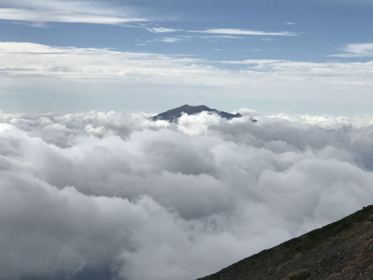 肩の小屋周辺でトイレを済ませたら、ここからは少しキツくなります。砂礫の道に始まり、岩場、ガレ場と続きます。脚許に十分留意して登りましょう。最後の岩場は厳しいですが、山頂3026mに立つと、360度の大パノラマが迎えてくれます。槍ヶ岳他の北アルプスの山々、雲海から顔を出す御嶽山、遠くに富士山も望めました。