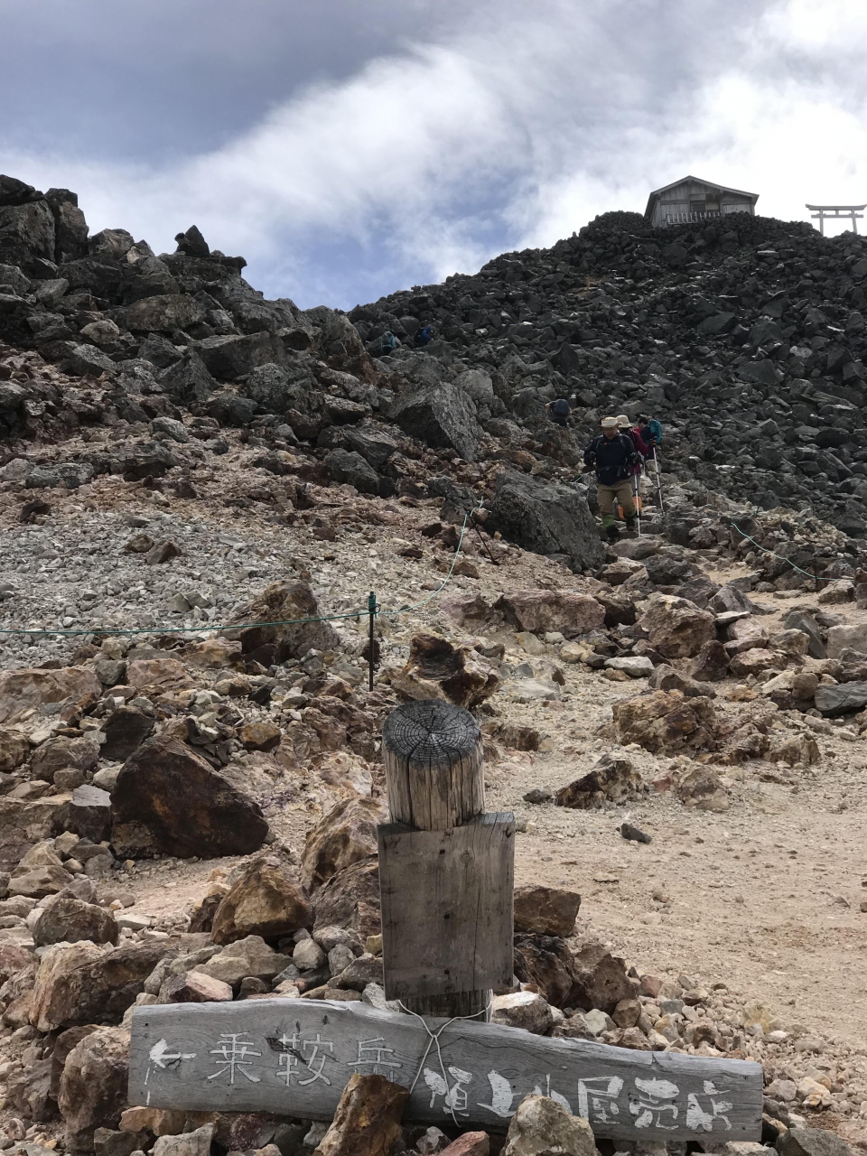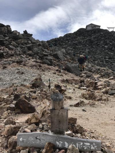 肩の小屋周辺でトイレを済ませたら、ここからは少しキツくなります。砂礫の道に始まり、岩場、ガレ場と続きます。脚許に十分留意して登りましょう。最後の岩場は厳しいですが、剣ヶ峰の頂である3026mに立つと、360度の大パノラマが迎えてくれます。槍ヶ岳他の北アルプスの山々、雲海から顔を出す御嶽山、遠くに富士山も望めました。