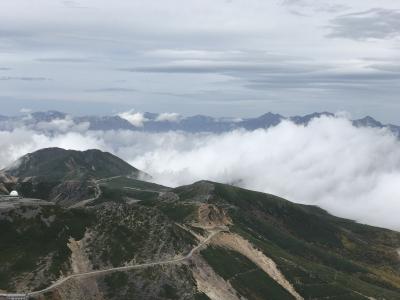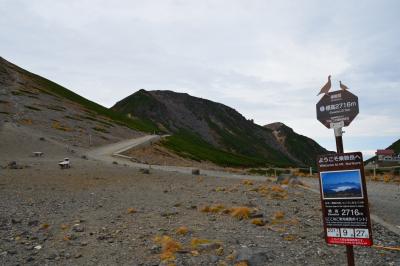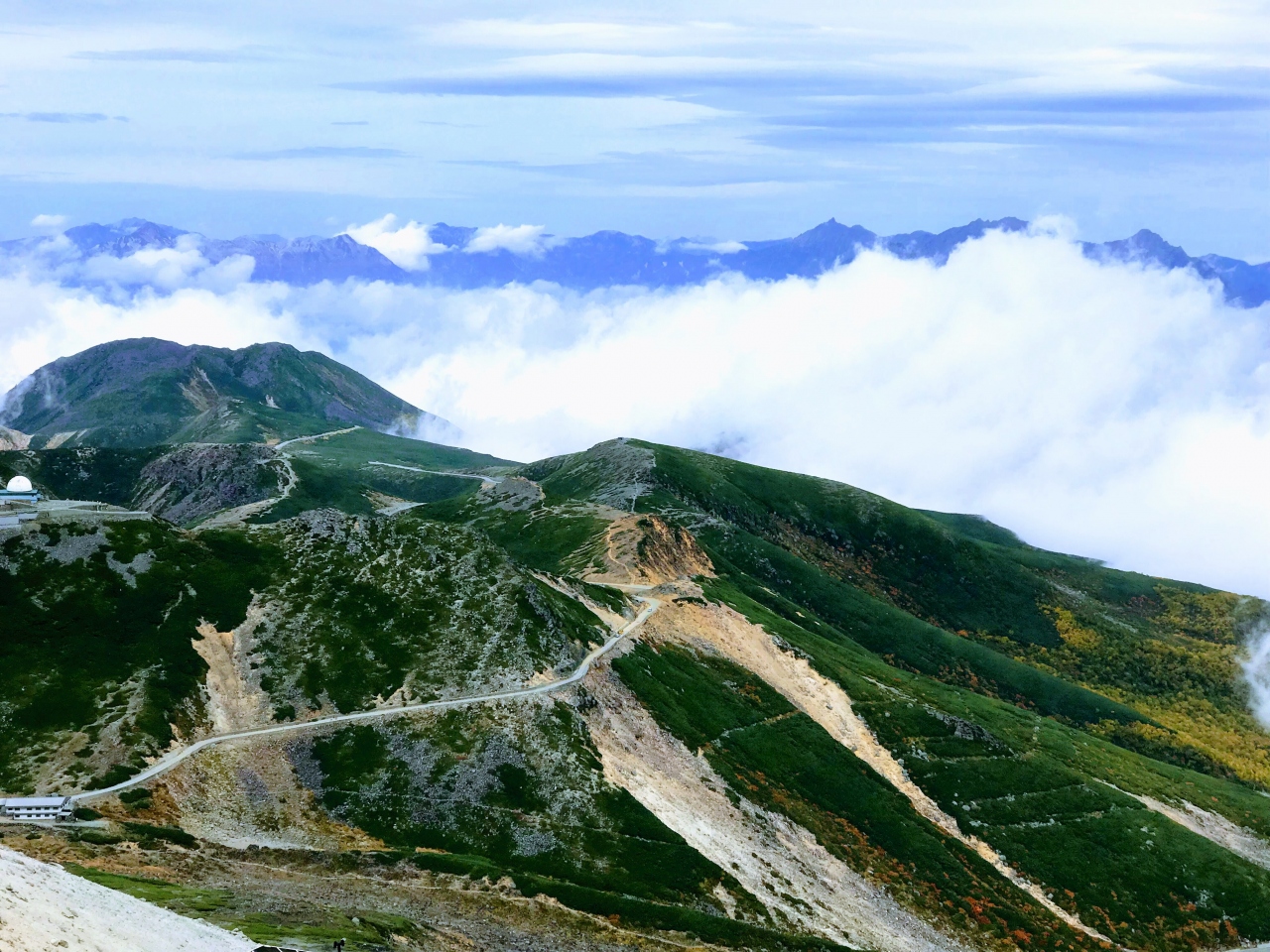 往きはシャトルバスの終点畳平一つ手前のバス停で降車することをおすすめします。トイレはないのでご注意を。その名も「標高2716m」バス停から富士見岳の右側を進む登山道は緩やかな坂道です。右に鶴ヶ池を見下ろしながら進み、コロナ観測所のドームが見えてきますがそのまま直進(右折は東大専用道路です)。左に下界、正面にこれから登る乗鞍の峰が見えます。