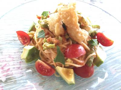 私は海老のフリットが乗った冷製パスタを注文しましたが、熱々のフリットはサクッと揚がっており、パスタはアボカドとトマトの彩りも美しい芸術作品のようでした。家内のフェットチーネも、もちもち感が丁度良い美味でした。- 旅行時期