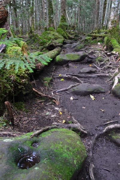 何台ものバスが観光客を運んでくる場所ですから、通常の池周回コースでは迷うことは無さそうなのですが、一人バスに戻って来ないと言って騒ぎになっていました。白駒の奥庭からの道でも探しに来た運転手さんと出会いました。こちらは明るい場所なのですが、実は岩石の上に木道が架けられており、よそ見をすると転落の危険もあります。油断は禁物です。- 旅行時期