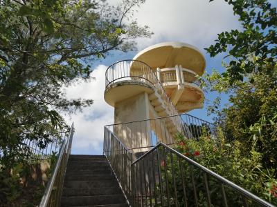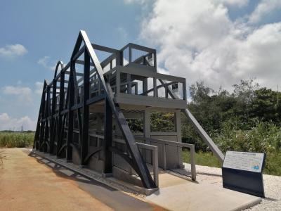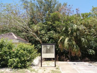 西港の一画、コウモリ公園キャンプ場の傍らに立っています。大きな記念碑の両側には2名のブロンズ像。向かって左側が帽子を被り、くわを担いだ開拓農民像。右側がタキシード姿の玉置半右衛門像。ああ…この方が…とちょっと感激。玉置半右衛門とは大東島の開拓の祖と言われる人物で南大東島内ではあちこちで目や耳にする人物。こんなところで“実物”に出会えるとは思ってもみませんでした。